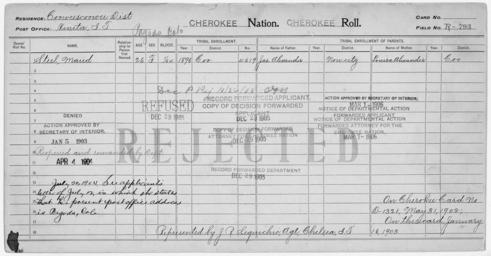 | Keywords: Enrollment for Cherokee Census Card R793 - NARA - 259856.tif  Scope and content Name James Alexander Type Parent Sex Male Name Louisa Alexander Type Parent Sex Female Name Maud Stell Type Rejected Age 26 Sex Female Degree Indian Blood 1/64 City of Residence Vinita General notes 259856 Local identifier 75-53A-CHEROKEE R793 Department of the Interior Office of Indian Affairs Office of the Commissioner to the Five Civilized Tribes 1893 - 1914 NARA's Southwest Region Fort Worth NRFA 1400 John Burgess Drive Fort Worth TX 76140 Record group Record Group 75 Records of the Bureau of Indian Affairs 1793 - 1999 Record group ARC 404 Enrollment Cards compiled 1898 - 1914 Series ARC 251747 File unit File unit ARC Variant control numbers NAIL Control Number NRFF-75-53A-18333<br /> NAIL Control Number NRFF-75-53A-357<br /> NAIL Control Number NRFF-75-53A-358<br /> NAIL Control Number NRFF-75-53A-CHEROKEE R793 yes Other versions <gallery> File Enrollment_for_Cherokee_Census_Card_R793_-_NARA_-_259856 tif tif File Enrollment_for_Cherokee_Census_Card_R793_-_NARA_-_259856 jpg jpg </gallery> NARA-cooperation PD-USGov Cherokee census cards NARA TIF images with categorized JPGs |