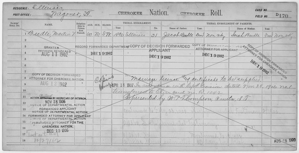 | Keywords: Enrollment for Cherokee Census Card D170 - NARA - 251918.tif Local identifier 75-53A-CHEROKEE D170 Department of the Interior Office of Indian Affairs Office of the Commissioner to the Five Civilized Tribes 1893 - 1914 NARA's Southwest Region Fort Worth NRFA 1400 John Burgess Drive Fort Worth TX 76140 Record group Record Group 75 Records of the Bureau of Indian Affairs 1793 - 1999 Record group ARC 404 Enrollment Cards compiled 1898 - 1914 Series ARC 251747 Variant control numbers NAIL Control Number NRFF-75-53A-1467<br /> NAIL Control Number NRFF-75-53A-1469<br /> NAIL Control Number NRFF-75-53A-1471<br /> NAIL Control Number NRFF-75-53A-CHEROKEE D170 General notes Scope and content Name Jacob Beedle Type Parent Sex Male Name Martin V Beedle Type Doubtful Age 60 Sex Male Degree Indian Blood Intermarried White City of Residence Wagoner Name Sarah Beedle Type Parent Sex Female File unit File unit ARC yes <gallery> File Enrollment_for_Cherokee_Census_Card_D170_-_NARA_-_251918 tif tif File Enrollment_for_Cherokee_Census_Card_D170_-_NARA_-_251918 jpg jpg </gallery> NARA-cooperation PD-USGov Cherokee census cards NARA TIF images with categorized JPGs |