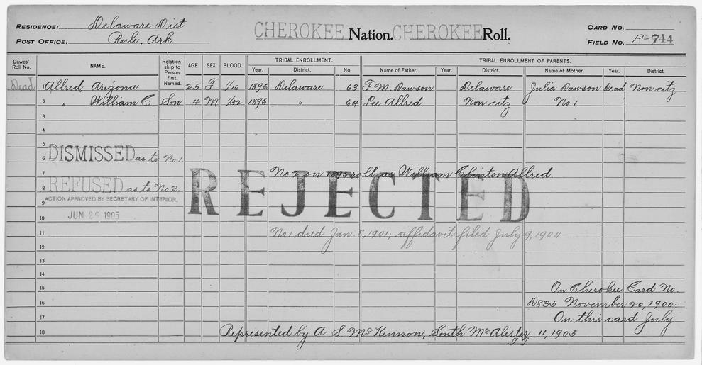 Keywords: Enrollment for Cherokee Census Card R944 - NARA - 260007.tif Scope and content Name Arizona Allred Type Rejected Age 25 Sex Female Degree Indian Blood 1/16 City of Residence Rule Arejected Name Lee Allred Type Parent Sex Male Name William C Allred Type Rejected Age 4 Sex Male Degree Indian Blood 1/32 City of Residence Rule Arejected Name Julia Dawson Type Parent Sex Female Name T M Dawson Type Parent Sex Male General notes 260007 Local identifier 75-53A-CHEROKEE R944 Department of the Interior Office of Indian Affairs Office of the Commissioner to the Five Civilized Tribes 1893 - 1914 NARA's Southwest Region Fort Worth NRFA 1400 John Burgess Drive Fort Worth TX 76140 Record group Record Group 75 Records of the Bureau of Indian Affairs 1793 - 1999 Record group ARC 404 Enrollment Cards compiled 1898 - 1914 Series ARC 251747 File unit File unit ARC Variant control numbers NAIL Control Number NRFF-75-53A-464<br /> NAIL Control Number NRFF-75-53A-465<br /> NAIL Control Number NRFF-75-53A-466<br /> NAIL Control Number NRFF-75-53A-5189<br /> NAIL Control Number NRFF-75-53A-5205<br /> NAIL Control Number NRFF-75-53A-CHEROKEE R944 yes Other versions <gallery> File Enrollment_for_Cherokee_Census_Card_R944_-_NARA_-_260007 tif tif File Enrollment_for_Cherokee_Census_Card_R944_-_NARA_-_260007 jpg jpg </gallery> NARA-cooperation PD-USGov Cherokee census cards NARA TIF images with categorized JPGs |
