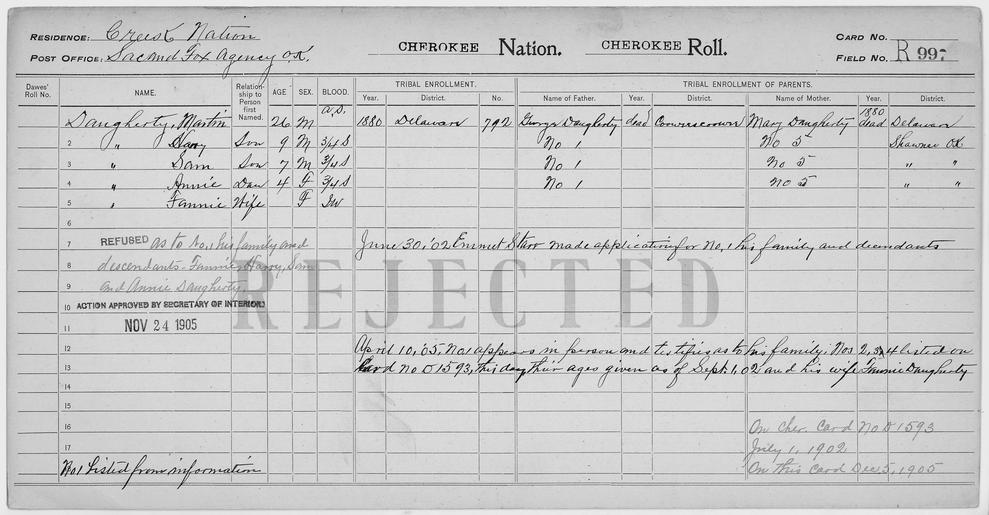 Keywords: Enrollment for Cherokee Census Card R997 - NARA - 260060.tif Scope and content Name Annie Daugherty Type Rejected Age 4 Sex Female Degree Indian Blood 3/4 City of Residence Sac Fox ok Name Fannie Daugherty Type Rejected Sex Female Degree Indian Blood Intermarried White City of Residence Sac Fox ok Name George Daugherty Type Parent Sex Male Name Harry Daugherty Type Rejected Age 9 Sex Male Degree Indian Blood 3/4 City of Residence Sac Fox ok Name Martin Daugherty Type Rejected Age 26 Sex Male Degree Indian Blood AS City of Residence Sac Fox ok Name Mary Daugherty Type Parent Sex Female Name Sam Daugherty Type Rejected Age 7 Sex Male Degree Indian Blood 3/4 City of Residence Sac Fox ok General notes 260060 Local identifier 75-53A-CHEROKEE R997 Department of the Interior Office of Indian Affairs Office of the Commissioner to the Five Civilized Tribes 1893 - 1914 NARA's Southwest Region Fort Worth NRFA 1400 John Burgess Drive Fort Worth TX 76140 Record group Record Group 75 Records of the Bureau of Indian Affairs 1793 - 1999 Record group ARC 404 Enrollment Cards compiled 1898 - 1914 Series ARC 251747 File unit File unit ARC Variant control numbers NAIL Control Number NRFF-75-53A-4964<br /> NAIL Control Number NRFF-75-53A-4974<br /> NAIL Control Number NRFF-75-53A-4975<br /> NAIL Control Number NRFF-75-53A-4976<br /> NAIL Control Number NRFF-75-53A-4987<br /> NAIL Control Number NRFF-75-53A-4989<br /> NAIL Control Number NRFF-75-53A-4995<br /> NAIL Control Number NRFF-75-53A-CHEROKEE R997 yes Other versions <gallery> File Enrollment_for_Cherokee_Census_Card_R997_-_NARA_-_260060 tif tif File Enrollment_for_Cherokee_Census_Card_R997_-_NARA_-_260060 jpg jpg </gallery> NARA-cooperation PD-USGov Cherokee census cards NARA TIF images with categorized JPGs |