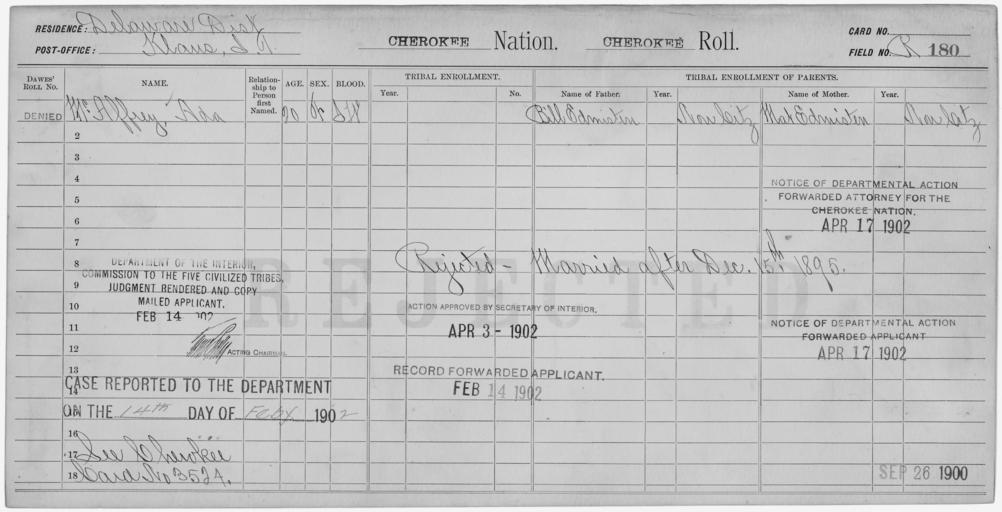 | Keywords: Enrollment for Cherokee Census Card R180 - NARA - 259243.jpg Scope and content Name Bill Edmisten Type Parent Sex Male Name Mat Edmisten Type Parent Sex Female Name Ada McAffrey Type Rejected Age 20 Sex Female Degree Indian Blood Intermarried White City of Residence Klaus General notes 259243 Local identifier 75-53A-CHEROKEE R180 Department of the Interior Office of Indian Affairs Office of the Commissioner to the Five Civilized Tribes 1893 - 1914 NARA's Southwest Region Fort Worth NRFA 1400 John Burgess Drive Fort Worth TX 76140 Record group Record Group 75 Records of the Bureau of Indian Affairs 1793 - 1999 Record group ARC 404 Enrollment Cards compiled 1898 - 1914 Series ARC 251747 File unit File unit ARC Variant control numbers NAIL Control Number NRFF-75-53A-12459<br /> NAIL Control Number NRFF-75-53A-5914<br /> NAIL Control Number NRFF-75-53A-5915<br /> NAIL Control Number NRFF-75-53A-CHEROKEE R180 Other versions <gallery> File Enrollment_for_Cherokee_Census_Card_R180_-_NARA_-_259243 tif tif File Enrollment_for_Cherokee_Census_Card_R180_-_NARA_-_259243 jpg jpg </gallery> NARA-cooperation PD-USGov Cherokee census cards |