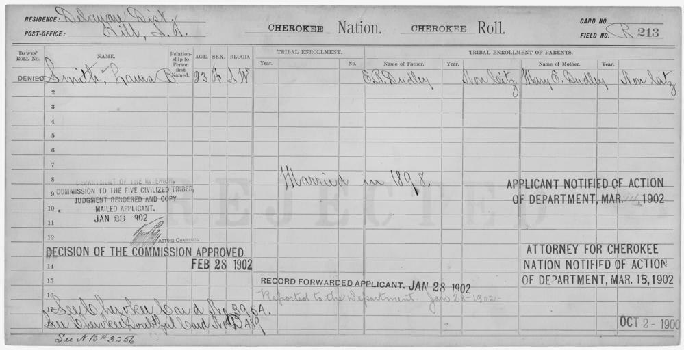 Keywords: Enrollment for Cherokee Census Card R213 - NARA - 259276.jpg Scope and content Name E R Dudley Type Parent Sex Male Name Mary E Dudley Type Parent Sex Female Name Laura B Smith Type Rejected Age 23 Sex Female Degree Indian Blood Intermarried White City of Residence Hill General notes 259276 Local identifier 75-53A-CHEROKEE R213 Department of the Interior Office of Indian Affairs Office of the Commissioner to the Five Civilized Tribes 1893 - 1914 NARA's Southwest Region Fort Worth NRFA 1400 John Burgess Drive Fort Worth TX 76140 Record group Record Group 75 Records of the Bureau of Indian Affairs 1793 - 1999 Record group ARC 404 Enrollment Cards compiled 1898 - 1914 Series ARC 251747 File unit File unit ARC Variant control numbers NAIL Control Number NRFF-75-53A-17818<br /> NAIL Control Number NRFF-75-53A-5767<br /> NAIL Control Number NRFF-75-53A-5777<br /> NAIL Control Number NRFF-75-53A-CHEROKEE R213 Other versions <gallery> File Enrollment_for_Cherokee_Census_Card_R213_-_NARA_-_259276 tif tif File Enrollment_for_Cherokee_Census_Card_R213_-_NARA_-_259276 jpg jpg </gallery> NARA-cooperation PD-USGov Cherokee census cards |