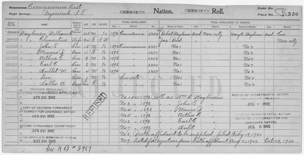 Keywords: Enrollment for Cherokee Census Card R350 - NARA - 259413.jpg Scope and content Name James Reed Type Parent Sex Male Name Arthur C Waybourn Type Rejected Age 9 Sex Male Degree Indian Blood 1/8 City of Residence Pryorcreek Name Clementine Waybourn Type Rejected Age 34 Sex Female Degree Indian Blood Intermarried White City of Residence Pryorcreek Name Earl C Waybourn Type Rejected Age 9 Sex Male Degree Indian Blood 1/8 City of Residence Pryorcreek Name Hullet M Waybourn Type Rejected Age 4 Sex Male Degree Indian Blood 1/8 City of Residence Pryorcreek Name John T Waybourn Type Rejected Age 15 Sex Male Degree Indian Blood 1/8 City of Residence Pryorcreek Name Levi Waybourn Type Rejected Age 1 Sex Male Degree Indian Blood 1/8 City of Residence Pryorcreek Name Mary A Waybourn Type Parent Sex Female Name Minnie B Waybourn Type Rejected Age 11 Sex Female Degree Indian Blood 1/8 City of Residence Pryorcreek Name Robert Waybourn Type Parent Sex Male Name Sallie A Waybourn Type Rejected Age 1 Sex Female Degree Indian Blood 1/8 City of Residence Pryorcreek Name William D Waybourn Type Rejected Age 45 Sex Male Degree Indian Blood 1/4 City of Residence Pryorcreek General notes 259413 Local identifier 75-53A-CHEROKEE R350 Department of the Interior Office of Indian Affairs Office of the Commissioner to the Five Civilized Tribes 1893 - 1914 NARA's Southwest Region Fort Worth NRFA 1400 John Burgess Drive Fort Worth TX 76140 Record group Record Group 75 Records of the Bureau of Indian Affairs 1793 - 1999 Record group ARC 404 Enrollment Cards compiled 1898 - 1914 Series ARC 251747 File unit File unit ARC Variant control numbers NAIL Control Number NRFF-75-53A-15597<br /> NAIL Control Number NRFF-75-53A-20925<br /> NAIL Control Number NRFF-75-53A-20927<br /> NAIL Control Number NRFF-75-53A-20928<br /> NAIL Control Number NRFF-75-53A-20931<br /> NAIL Control Number NRFF-75-53A-20933<br /> NAIL Control Number NRFF-75-53A-20934<br /> NAIL Control Number NRFF-75-53A-20935<br /> NAIL Control Number NRFF-75-53A-20936<br /> NAIL Control Number NRFF-75-53A-20937<br /> NAIL Control Number NRFF-75-53A-20939<br /> NAIL Control Number NRFF-75-53A-20941<br /> NAIL Control Number NRFF-75-53A-CHEROKEE R350 Other versions <gallery> File Enrollment_for_Cherokee_Census_Card_R350_-_NARA_-_259413 tif tif File Enrollment_for_Cherokee_Census_Card_R350_-_NARA_-_259413 jpg jpg </gallery> NARA-cooperation PD-USGov Cherokee census cards |
