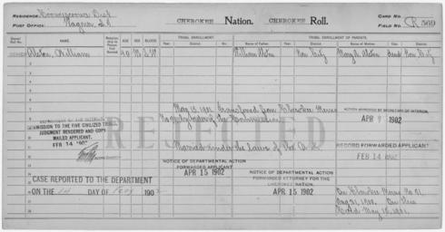 | Keywords: Enrollment for Cherokee Census Card R569 - NARA - 259632.jpg Scope and content Name Mary A Alston Type Parent Sex Female Name William Alston Type Rejected Age 42 Sex Male Degree Indian Blood Intermarried White City of Residence Wagonerejected Name William Alston Type Parent Sex Male General notes 259632 Local identifier 75-53A-CHEROKEE R569 Department of the Interior Office of Indian Affairs Office of the Commissioner to the Five Civilized Tribes 1893 - 1914 NARA's Southwest Region Fort Worth NRFA 1400 John Burgess Drive Fort Worth TX 76140 Record group Record Group 75 Records of the Bureau of Indian Affairs 1793 - 1999 Record group ARC 404 Enrollment Cards compiled 1898 - 1914 Series ARC 251747 File unit File unit ARC Variant control numbers NAIL Control Number NRFF-75-53A-474<br /> NAIL Control Number NRFF-75-53A-475<br /> NAIL Control Number NRFF-75-53A-476<br /> NAIL Control Number NRFF-75-53A-CHEROKEE R569 Other versions <gallery> File Enrollment_for_Cherokee_Census_Card_R569_-_NARA_-_259632 tif tif File Enrollment_for_Cherokee_Census_Card_R569_-_NARA_-_259632 jpg jpg </gallery> NARA-cooperation PD-USGov Cherokee census cards |
