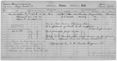 | Keywords: Enrollment for Cherokee Census Card R654 - NARA - 259717.jpg Scope and content Name A B Barrett Type Parent Sex Male Name Alethia F Barrett Type Rejected Age 28 Sex Female Degree Indian Blood 1/8 City of Residence Pryor Creek Name Clarance S Barrett Type Rejected Age 1 Sex Male Degree Indian Blood 1/16 City of Residence Pryor Creek Name Claud G Barrett Type Rejected Age 1 Sex Male Degree Indian Blood 1/16 City of Residence Pryor Creek Name Margaret Horn Type Parent Sex Female Name William T Horn Type Parent Sex Male General notes 259717 Local identifier 75-53A-CHEROKEE R654 Department of the Interior Office of Indian Affairs Office of the Commissioner to the Five Civilized Tribes 1893 - 1914 NARA's Southwest Region Fort Worth NRFA 1400 John Burgess Drive Fort Worth TX 76140 Record group Record Group 75 Records of the Bureau of Indian Affairs 1793 - 1999 Record group ARC 404 Enrollment Cards compiled 1898 - 1914 Series ARC 251747 File unit File unit ARC Variant control numbers NAIL Control Number NRFF-75-53A-1125<br /> NAIL Control Number NRFF-75-53A-1126<br /> NAIL Control Number NRFF-75-53A-1127<br /> NAIL Control Number NRFF-75-53A-1128<br /> NAIL Control Number NRFF-75-53A-9167<br /> NAIL Control Number NRFF-75-53A-9185<br /> NAIL Control Number NRFF-75-53A-CHEROKEE R654 Other versions <gallery> File Enrollment_for_Cherokee_Census_Card_R654_-_NARA_-_259717 tif tif File Enrollment_for_Cherokee_Census_Card_R654_-_NARA_-_259717 jpg jpg </gallery> NARA-cooperation PD-USGov Cherokee census cards |