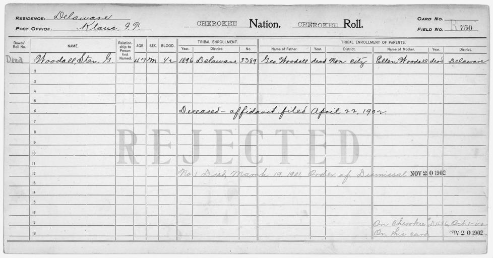 | Keywords: Enrollment for Cherokee Census Card R750 - NARA - 259813.jpg Scope and content Name Ellen Woodall Type Parent Sex Female Name George Woodall Type Parent Sex Male Name Stan G Woodall Type Rejected Age 47 Sex Male Degree Indian Blood 1/2 City of Residence Klaus General notes 259813 Local identifier 75-53A-CHEROKEE R750 Department of the Interior Office of Indian Affairs Office of the Commissioner to the Five Civilized Tribes 1893 - 1914 NARA's Southwest Region Fort Worth NRFA 1400 John Burgess Drive Fort Worth TX 76140 Record group Record Group 75 Records of the Bureau of Indian Affairs 1793 - 1999 Record group ARC 404 Enrollment Cards compiled 1898 - 1914 Series ARC 251747 File unit File unit ARC Variant control numbers NAIL Control Number NRFF-75-53A-22313<br /> NAIL Control Number NRFF-75-53A-22316<br /> NAIL Control Number NRFF-75-53A-22331<br /> NAIL Control Number NRFF-75-53A-CHEROKEE R750 Other versions <gallery> File Enrollment_for_Cherokee_Census_Card_R750_-_NARA_-_259813 tif tif File Enrollment_for_Cherokee_Census_Card_R750_-_NARA_-_259813 jpg jpg </gallery> NARA-cooperation PD-USGov Cherokee census cards |