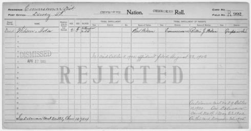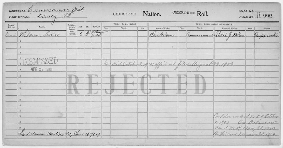 Keywords: Enrollment for Cherokee Census Card R992 - NARA - 260055.jpg Scope and content Name Ida Wilson Type Rejected Age 2 Sex Female Degree Indian Blood 1/2 City of Residence Dewey Name Reed Wilson Type Parent Sex Male Name Rollie J Wilson Type Parent Sex Female General notes 260055 Local identifier 75-53A-CHEROKEE R992 Department of the Interior Office of Indian Affairs Office of the Commissioner to the Five Civilized Tribes 1893 - 1914 NARA's Southwest Region Fort Worth NRFA 1400 John Burgess Drive Fort Worth TX 76140 Record group Record Group 75 Records of the Bureau of Indian Affairs 1793 - 1999 Record group ARC 404 Enrollment Cards compiled 1898 - 1914 Series ARC 251747 File unit File unit ARC Variant control numbers NAIL Control Number NRFF-75-53A-21916<br /> NAIL Control Number NRFF-75-53A-22025<br /> NAIL Control Number NRFF-75-53A-22037<br /> NAIL Control Number NRFF-75-53A-CHEROKEE R992 Other versions <gallery> File Enrollment_for_Cherokee_Census_Card_R992_-_NARA_-_260055 tif tif File Enrollment_for_Cherokee_Census_Card_R992_-_NARA_-_260055 jpg jpg </gallery> NARA-cooperation PD-USGov Cherokee census cards |