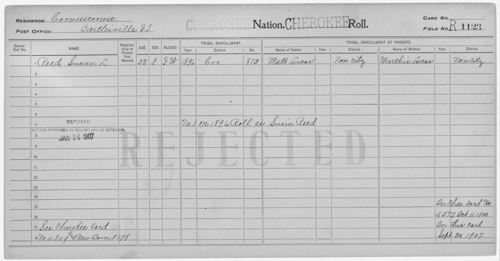 Keywords: Enrollment for Cherokee Census Card R1123 - NARA - 260186.jpg Scope and content Name Marthie Lucas Type Parent Sex Female Name Matt Lucas Type Parent Sex Male Name Susan L Reed Type Rejected Age 33 Sex Female Degree Indian Blood Intermarried White City of Residence Bartlesville General notes 260186 Local identifier 75-53A-CHEROKEE R1123 Department of the Interior Office of Indian Affairs Office of the Commissioner to the Five Civilized Tribes 1893 - 1914 NARA's Southwest Region Fort Worth NRFA 1400 John Burgess Drive Fort Worth TX 76140 Record group Record Group 75 Records of the Bureau of Indian Affairs 1793 - 1999 Record group ARC 404 Enrollment Cards compiled 1898 - 1914 Series ARC 251747 File unit File unit ARC Variant control numbers NAIL Control Number NRFF-75-53A-11688<br /> NAIL Control Number NRFF-75-53A-11691<br /> NAIL Control Number NRFF-75-53A-15606<br /> NAIL Control Number NRFF-75-53A-CHEROKEE R1123 Other versions <gallery> File Enrollment_for_Cherokee_Census_Card_R1123_-_NARA_-_260186 tif tif File Enrollment_for_Cherokee_Census_Card_R1123_-_NARA_-_260186 jpg jpg </gallery> NARA-cooperation PD-USGov Cherokee census cards |