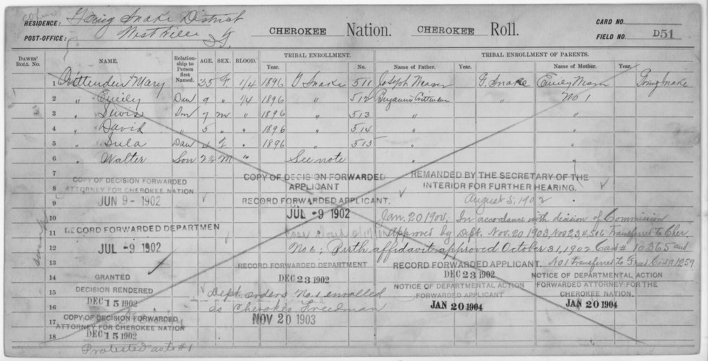 | Keywords: Enrollment for Cherokee Census Card D51 - NARA - 251799.tif Local identifier 75-53A-CHEROKEE D51 Department of the Interior Office of Indian Affairs Office of the Commissioner to the Five Civilized Tribes 1893 - 1914 NARA's Southwest Region Fort Worth NRFA 1400 John Burgess Drive Fort Worth TX 76140 Record group Record Group 75 Records of the Bureau of Indian Affairs 1793 - 1999 Record group ARC 404 Enrollment Cards compiled 1898 - 1914 Series ARC 251747 Variant control numbers NAIL Control Number NRFF-75-53A-20963<br /> NAIL Control Number NRFF-75-53A-20975<br /> NAIL Control Number NRFF-75-53A-4651<br /> NAIL Control Number NRFF-75-53A-4655<br /> NAIL Control Number NRFF-75-53A-4657<br /> NAIL Control Number NRFF-75-53A-4672<br /> NAIL Control Number NRFF-75-53A-4673<br /> NAIL Control Number NRFF-75-53A-4678<br /> NAIL Control Number NRFF-75-53A-4691<br /> NAIL Control Number NRFF-75-53A-CHEROKEE D51 General notes Scope and content Name Beniamin Crittenden Type Parent Sex Male Name David Crittenden Type Doubtful Age 5 Sex Male Degree Indian Blood 1/4 City of Residence Westville Name Emily Crittenden Type Doubtful Age 9 Sex Female Degree Indian Blood 1/4 City of Residence Westville Name Lewis Crittenden Type Doubtful Age 7 Sex Male Degree Indian Blood 1/4 City of Residence Westville Name Lula Crittenden Type Doubtful Age 4 Sex Female Degree Indian Blood 1/4 City of Residence Westville Name Mary Crittenden Type Doubtful Age 35 Sex Female Degree Indian Blood 1/4 City of Residence Westville Name Walter Crittenden Type Doubtful Age 2 Sex Male Degree Indian Blood 1/4 City of Residence Westville Name Emily Weaver Type Parent Sex Female Name Joseph Weaver Type Parent Sex Male File unit File unit ARC yes <gallery> File Enrollment_for_Cherokee_Census_Card_D51_-_NARA_-_251799 tif tif File Enrollment_for_Cherokee_Census_Card_D51_-_NARA_-_251799 jpg jpg </gallery> NARA-cooperation PD-USGov Cherokee census cards NARA TIF images with categorized JPGs |