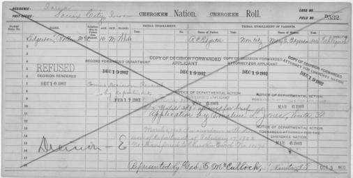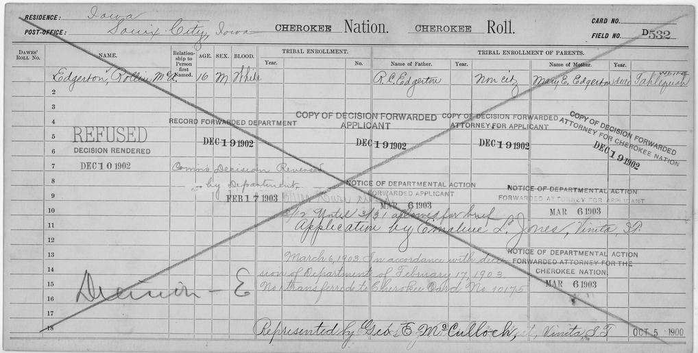 Keywords: Enrollment for Cherokee Census Card D532 - NARA - 252280.tif Local identifier 75-53A-CHEROKEE D532 Department of the Interior Office of Indian Affairs Office of the Commissioner to the Five Civilized Tribes 1893 - 1914 NARA's Southwest Region Fort Worth NRFA 1400 John Burgess Drive Fort Worth TX 76140 Record group Record Group 75 Records of the Bureau of Indian Affairs 1793 - 1999 Record group ARC 404 Enrollment Cards compiled 1898 - 1914 Series ARC 251747 Variant control numbers NAIL Control Number NRFF-75-53A-54069<br /> NAIL Control Number NRFF-75-53A-54070<br /> NAIL Control Number NRFF-75-53A-54071<br /> NAIL Control Number NRFF-75-53A-CHEROKEE D532 General notes Scope and content Name Rollin M Edgerton Type Doubtful Age 16 Sex Male Degree Indian Blood W Roll Number Not Reported Post Office Sioux City IA Name R C Edgerton Type Parent Age Not Reported Sex Male Degree Indian Blood Not Reported Roll Number Not Reported Post Office Not Reported Name Mary E Edgerton Type Parent Age Not Reported Sex Female Degree Indian Blood Not Reported Roll Number Not Reported Post Office Not Reported File unit File unit ARC yes <gallery> File Enrollment_for_Cherokee_Census_Card_D532_-_NARA_-_252280 tif tif File Enrollment_for_Cherokee_Census_Card_D532_-_NARA_-_252280 jpg jpg </gallery> NARA-cooperation PD-USGov Cherokee census cards NARA TIF images with categorized JPGs |