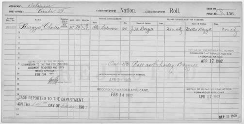 | Keywords: Enrollment for Cherokee Census Card R156 - NARA - 259219.tif Scope and content Name Charles Bazzell Type Rejected Age 25 Sex Male Degree Indian Blood Intermarried White City of Residence Vinita Name J M Bazzell Type Parent Sex Male Name Mattie Bazzell Type Parent Sex Female General notes 259219 Local identifier 75-53A-CHEROKEE R156 Department of the Interior Office of Indian Affairs Office of the Commissioner to the Five Civilized Tribes 1893 - 1914 NARA's Southwest Region Fort Worth NRFA 1400 John Burgess Drive Fort Worth TX 76140 Record group Record Group 75 Records of the Bureau of Indian Affairs 1793 - 1999 Record group ARC 404 Enrollment Cards compiled 1898 - 1914 Series ARC 251747 File unit File unit ARC Variant control numbers NAIL Control Number NRFF-75-53A-1219<br /> NAIL Control Number NRFF-75-53A-1221<br /> NAIL Control Number NRFF-75-53A-1223<br /> NAIL Control Number NRFF-75-53A-CHEROKEE R156 yes Other versions <gallery> File Enrollment_for_Cherokee_Census_Card_R156_-_NARA_-_259219 tif tif File Enrollment_for_Cherokee_Census_Card_R156_-_NARA_-_259219 jpg jpg </gallery> NARA-cooperation PD-USGov Cherokee census cards NARA TIF images with categorized JPGs |