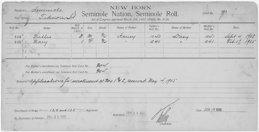 | Keywords: Enrollment for Seminole Census Card 99 - NARA - 267673.tif Scope and content Name Chepan Chupco Type Parent Sex Male City of Residence k Name Dicey Harjo Type By Blood Age 30 Sex Female Degree Indian Blood Full Roll Number 347 City of Residence k Name Thle Harjo Type By Blood Age 43 Sex Male Degree Indian Blood 1/2 Roll Number 346 City of Residence nh Name Henista Type By Blood Age 25 Sex Male Degree Indian Blood Full City of Residence k Name Kochupna Type Parent Sex Male City of Residence nh Name Lizzie Type Parent Sex Female City of Residence k Name Milley Type Parent Sex Female City of Residence k Name Turner Wolf Type By Blood Age 8 Sex Male Degree Indian Blood Full Roll Number 348 City of Residence nh Name Hosia Yahola Type Parent Sex Male City of Residence Creek Name Willie Type Newborn Age 3 Sex Male Degree Indian Blood 3/4 Roll Number 124 Post Office Tidmore Name Mary Type Newborn Age 1 Sex Female Degree Indian Blood 3/4 Roll Number 125 Post Office Tidmore General notes 267673 Local identifier 75-53A-SEMINOLE 99 Department of the Interior Office of Indian Affairs Office of the Commissioner to the Five Civilized Tribes 1893 - 1914 NARA's Southwest Region Fort Worth NRFA 1400 John Burgess Drive Fort Worth TX 76140 Record group Record Group 75 Records of the Bureau of Indian Affairs 1793 - 1999 Record group ARC 404 Enrollment Cards compiled 1898 - 1914 Series ARC 251747 File unit File unit ARC Variant control numbers NAIL Control Number NRFF-75-53A-28062<br /> NAIL Control Number NRFF-75-53A-34278<br /> NAIL Control Number NRFF-75-53A-35121<br /> NAIL Control Number NRFF-75-53A-36025<br /> NAIL Control Number NRFF-75-53A-38885<br /> NAIL Control Number NRFF-75-53A-39654<br /> NAIL Control Number NRFF-75-53A-42148<br /> NAIL Control Number NRFF-75-53A-51902<br /> NAIL Control Number NRFF-75-53A-52138<br /> NAIL Control Number NRFF-75-53A-52666<br /> NAIL Control Number NRFF-75-53A-52667<br /> NAIL Control Number NRFF-75-53A-SEMINOLE 99 yes Other versions <gallery> File Enrollment_for_Seminole_Census_Card_99_-_NARA_-_267673 tif tif File Enrollment_for_Seminole_Census_Card_99_-_NARA_-_267673 jpg jpg </gallery> NARA-cooperation PD-USGov Cherokee census cards NARA TIF images with categorized JPGs |