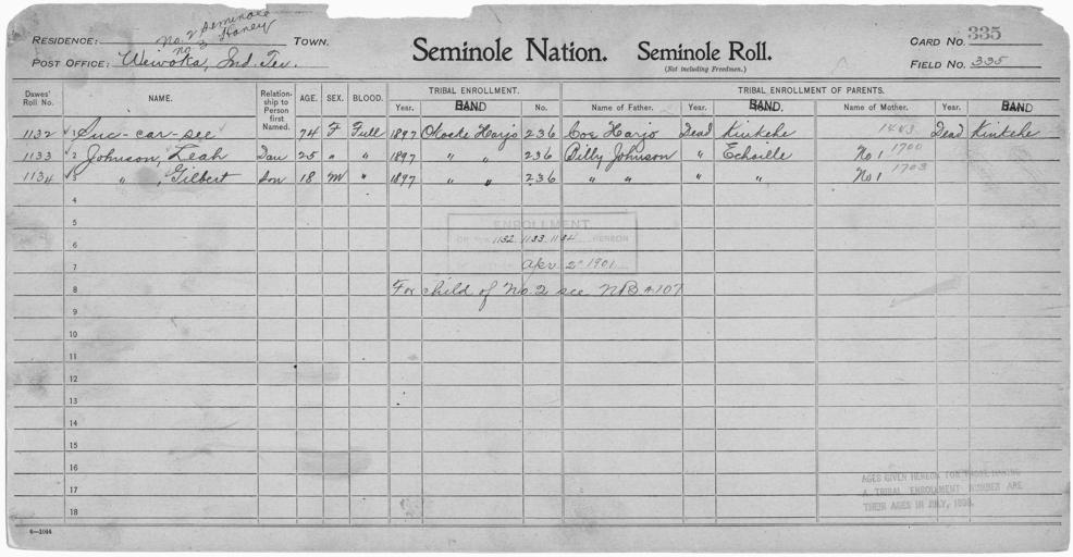 | Keywords: Enrollment for Seminole Census Card 335 - NARA - 267909.jpg Scope and content Name Coe Harjo Type Parent Sex Male City of Residence k Name Billy Johnson Type Parent Sex Male City of Residence e Name Gilbert Johnson Type By Blood Age 18 Sex Male Degree Indian Blood Full Roll Number 1134 City of Residence oh Name Leah Johnson Type By Blood Age 25 Sex Female Degree Indian Blood Full Roll Number 1133 City of Residence oh Name Succarsee Type By Blood Age 74 Sex Female Degree Indian Blood Full Roll Number 1132 City of Residence oh General notes 267909 Local identifier 75-53A-SEMINOLE 335 Department of the Interior Office of Indian Affairs Office of the Commissioner to the Five Civilized Tribes 1893 - 1914 NARA's Southwest Region Fort Worth NRFA 1400 John Burgess Drive Fort Worth TX 76140 Record group Record Group 75 Records of the Bureau of Indian Affairs 1793 - 1999 Record group ARC 404 Enrollment Cards compiled 1898 - 1914 Series ARC 251747 File unit File unit ARC Variant control numbers NAIL Control Number NRFF-75-53A-34222<br /> NAIL Control Number NRFF-75-53A-37732<br /> NAIL Control Number NRFF-75-53A-37817<br /> NAIL Control Number NRFF-75-53A-37867<br /> NAIL Control Number NRFF-75-53A-48165<br /> NAIL Control Number NRFF-75-53A-SEMINOLE 335 Other versions <gallery> File Enrollment_for_Seminole_Census_Card_335_-_NARA_-_267909 tif tif File Enrollment_for_Seminole_Census_Card_335_-_NARA_-_267909 jpg jpg </gallery> NARA-cooperation PD-USGov Seminole census cards |
