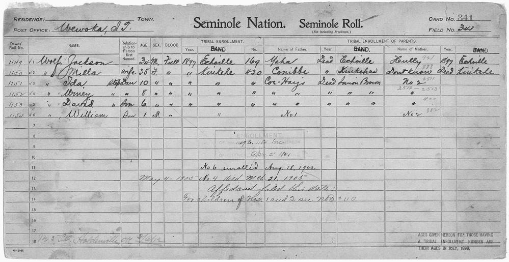 | Keywords: Enrollment for Seminole Census Card 341 - NARA - 267915.tif Scope and content Name Conibbe Type Parent Sex Male City of Residence k Name Coe Harjo Type Parent Sex Male City of Residence sb Name Hully Type Parent Sex Female City of Residence e Name David Wolf Type By Blood Age 6 Sex Male Degree Indian Blood Full Roll Number 1153 City of Residence k Name Ida Wolf Type By Blood Age 10 Sex Female Degree Indian Blood Full Roll Number 1151 City of Residence k Name Jackson Wolf Type By Blood Age 34 Sex Male Degree Indian Blood Full Roll Number 1149 City of Residence e Name Milla Wolf Type By Blood Age 35 Sex Female Degree Indian Blood Full Roll Number 1150 City of Residence k Name William Wolf Type By Blood Age 1 Sex Male Degree Indian Blood Full Roll Number 1154 Name Winey Wolf Type By Blood Age 8 Sex Female Degree Indian Blood Full Roll Number 1152 City of Residence k Name Yaha Type Parent Sex Male City of Residence e General notes 267915 Local identifier 75-53A-SEMINOLE 341 Department of the Interior Office of Indian Affairs Office of the Commissioner to the Five Civilized Tribes 1893 - 1914 NARA's Southwest Region Fort Worth NRFA 1400 John Burgess Drive Fort Worth TX 76140 Record group Record Group 75 Records of the Bureau of Indian Affairs 1793 - 1999 Record group ARC 404 Enrollment Cards compiled 1898 - 1914 Series ARC 251747 File unit File unit ARC Variant control numbers NAIL Control Number NRFF-75-53A-28684<br /> NAIL Control Number NRFF-75-53A-34224<br /> NAIL Control Number NRFF-75-53A-36899<br /> NAIL Control Number NRFF-75-53A-51822<br /> NAIL Control Number NRFF-75-53A-51838<br /> NAIL Control Number NRFF-75-53A-51844<br /> NAIL Control Number NRFF-75-53A-51875<br /> NAIL Control Number NRFF-75-53A-51911<br /> NAIL Control Number NRFF-75-53A-51912<br /> NAIL Control Number NRFF-75-53A-52026<br /> NAIL Control Number NRFF-75-53A-SEMINOLE 341 yes Other versions <gallery> File Enrollment_for_Seminole_Census_Card_341_-_NARA_-_267915 tif tif File Enrollment_for_Seminole_Census_Card_341_-_NARA_-_267915 jpg jpg </gallery> NARA-cooperation PD-USGov Seminole census cards NARA TIF images with categorized JPGs |