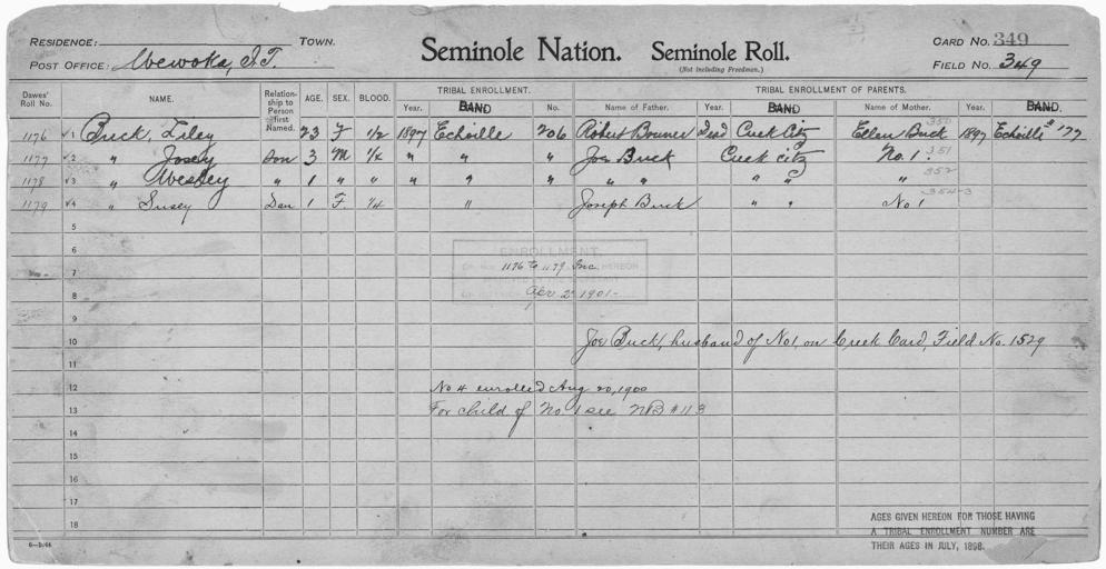 | Keywords: Enrollment for Seminole Census Card 349 - NARA - 267923.jpg Scope and content Name Robert Bruner Type Parent Sex Male City of Residence Creek Name Ellen Buck Type Parent Sex Female City of Residence e Name Joe Buck Type Parent Sex Male City of Residence Creek Name Joseph Buck Type Parent Sex Male City of Residence Creek Name Josey Buck Type By Blood Age 3 Sex Male Degree Indian Blood 1/4 Roll Number 1177 City of Residence e Name Liley Buck Type By Blood Age 23 Sex Female Degree Indian Blood 1/2 Roll Number 1176 City of Residence e Name Susey Buck Type By Blood Age 1 Sex Female Degree Indian Blood 1/4 Roll Number 1179 City of Residence e Name Wesley Buck Type By Blood Age 1 Sex Male Degree Indian Blood 1/4 Roll Number 1178 City of Residence e General notes 267923 Local identifier 75-53A-SEMINOLE 349 Department of the Interior Office of Indian Affairs Office of the Commissioner to the Five Civilized Tribes 1893 - 1914 NARA's Southwest Region Fort Worth NRFA 1400 John Burgess Drive Fort Worth TX 76140 Record group Record Group 75 Records of the Bureau of Indian Affairs 1793 - 1999 Record group ARC 404 Enrollment Cards compiled 1898 - 1914 Series ARC 251747 File unit File unit ARC Variant control numbers NAIL Control Number NRFF-75-53A-26388<br /> NAIL Control Number NRFF-75-53A-26485<br /> NAIL Control Number NRFF-75-53A-26491<br /> NAIL Control Number NRFF-75-53A-26499<br /> NAIL Control Number NRFF-75-53A-26501<br /> NAIL Control Number NRFF-75-53A-26503<br /> NAIL Control Number NRFF-75-53A-26528<br /> NAIL Control Number NRFF-75-53A-26533<br /> NAIL Control Number NRFF-75-53A-SEMINOLE 349 Other versions <gallery> File Enrollment_for_Seminole_Census_Card_349_-_NARA_-_267923 tif tif File Enrollment_for_Seminole_Census_Card_349_-_NARA_-_267923 jpg jpg </gallery> NARA-cooperation PD-USGov Seminole census cards |