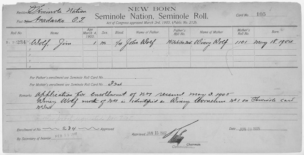 | Keywords: Enrollment for Seminole Census Card 105 - NARA - 267679.tif Scope and content Name Acheiske Type Parent Sex Female City of Residence tp Name Alex Harjo Type By Blood Age 2 Sex Male Degree Indian Blood 3/4 Roll Number 372 City of Residence tp Name Duffie Harjo Type By Blood Age 18 Sex Male Degree Indian Blood 3/4 Roll Number 369 City of Residence tp Name Fanny Harjo Type By Blood Age 9 Sex Female Degree Indian Blood 3/4 Roll Number 371 City of Residence tp Name Jennie Harjo Type By Blood Age 45 Sex Female Degree Indian Blood 1/2 Roll Number 368 City of Residence tp Name Passuk Harjo Type By Blood Age 65 Sex Male Degree Indian Blood Full Roll Number 367 City of Residence tp Name Sarah Harjo Type By Blood Age 4 Sex Female Degree Indian Blood 3/4 City of Residence tp Name Webster Harjo Type By Blood Age 12 Sex Male Degree Indian Blood 3/4 Roll Number 370 City of Residence tp Name Madelia Type Parent Sex Female City of Residence tp Name Hobiah Palmer Type Parent Sex Male City of Residence Creek Name Jim Wolf Type Newborn Age 1 Sex Male Degree Indian Blood 1/4 Roll Number 234 Post Office Anadarko General notes 267679 Local identifier 75-53A-SEMINOLE 105 Department of the Interior Office of Indian Affairs Office of the Commissioner to the Five Civilized Tribes 1893 - 1914 NARA's Southwest Region Fort Worth NRFA 1400 John Burgess Drive Fort Worth TX 76140 Record group Record Group 75 Records of the Bureau of Indian Affairs 1793 - 1999 Record group ARC 404 Enrollment Cards compiled 1898 - 1914 Series ARC 251747 File unit File unit ARC Variant control numbers NAIL Control Number NRFF-75-53A-22665<br /> NAIL Control Number NRFF-75-53A-34057<br /> NAIL Control Number NRFF-75-53A-34282<br /> NAIL Control Number NRFF-75-53A-34325<br /> NAIL Control Number NRFF-75-53A-34479<br /> NAIL Control Number NRFF-75-53A-34957<br /> NAIL Control Number NRFF-75-53A-35033<br /> NAIL Control Number NRFF-75-53A-35265<br /> NAIL Control Number NRFF-75-53A-40282<br /> NAIL Control Number NRFF-75-53A-43506<br /> NAIL Control Number NRFF-75-53A-52675<br /> NAIL Control Number NRFF-75-53A-SEMINOLE 105 yes Other versions <gallery> File Enrollment_for_Seminole_Census_Card_105_-_NARA_-_267679 tif tif File Enrollment_for_Seminole_Census_Card_105_-_NARA_-_267679 jpg jpg </gallery> NARA-cooperation PD-USGov Cherokee census cards NARA TIF images with categorized JPGs |