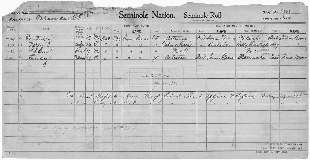 | Keywords: Enrollment for Seminole Census Card 366 - NARA - 267940.tif Scope and content Name Adam Type By Blood Age 7 Sex Male Degree Indian Blood Full Roll Number 1236 City of Residence sb Name Artusse Type Parent Sex Male City of Residence sb Name Sally Bowlegs Type Parent Sex Female City of Residence sb Name Contaley Type By Blood Age 28 Sex Male Degree Indian Blood Full Roll Number 1234 City of Residence sb Name Fiklumeke Type Parent Sex Female City of Residence sb Name Pahose Harjo Type Parent Sex Male City of Residence k Name Lucy Type By Blood Age 19 Sex Female Degree Indian Blood Full Roll Number 1237 City of Residence sb Name Nelly Type By Blood Age 20 Sex Female Degree Indian Blood Full Roll Number 1235 City of Residence sb Name Pohige Type Parent Sex Female City of Residence sb General notes 267940 Local identifier 75-53A-SEMINOLE 366 Department of the Interior Office of Indian Affairs Office of the Commissioner to the Five Civilized Tribes 1893 - 1914 NARA's Southwest Region Fort Worth NRFA 1400 John Burgess Drive Fort Worth TX 76140 Record group Record Group 75 Records of the Bureau of Indian Affairs 1793 - 1999 Record group ARC 404 Enrollment Cards compiled 1898 - 1914 Series ARC 251747 File unit File unit ARC Variant control numbers NAIL Control Number NRFF-75-53A-22675<br /> NAIL Control Number NRFF-75-53A-23404<br /> NAIL Control Number NRFF-75-53A-25523<br /> NAIL Control Number NRFF-75-53A-28720<br /> NAIL Control Number NRFF-75-53A-31566<br /> NAIL Control Number NRFF-75-53A-34936<br /> NAIL Control Number NRFF-75-53A-40173<br /> NAIL Control Number NRFF-75-53A-43045<br /> NAIL Control Number NRFF-75-53A-44254<br /> NAIL Control Number NRFF-75-53A-SEMINOLE 366 yes Other versions <gallery> File Enrollment_for_Seminole_Census_Card_366_-_NARA_-_267940 tif tif File Enrollment_for_Seminole_Census_Card_366_-_NARA_-_267940 jpg jpg </gallery> NARA-cooperation PD-USGov Seminole census cards NARA TIF images with categorized JPGs |