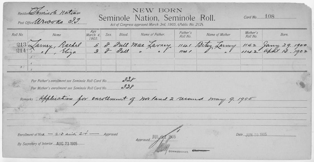 | Keywords: Enrollment for Seminole Census Card 108 - NARA - 267682.tif Scope and content Name Dinah Type By Blood Age 14 Sex Female Degree Indian Blood Full Roll Number 380 City of Residence yh Name Charlie Harjo Type Parent Sex Male City of Residence tl Name Meka Harjo Type Parent Sex Male City of Residence th Name Mitchile Type By Blood Age 47 Sex Male Degree Indian Blood Full Roll Number 377 City of Residence th Name Sakteke Type By Blood Age 35 Sex Female Degree Indian Blood Full Roll Number 378 City of Residence yh Name Samuel Type By Blood Age 1 Sex Male Degree Indian Blood Full Roll Number 382 City of Residence yh Name Tusechokte Type Parent Sex Female City of Residence yh Name Webster Type By Blood Age 10 Sex Male Degree Indian Blood Full Roll Number 381 City of Residence yh Name Willie Type By Blood Age 17 Sex Male Degree Indian Blood Full Roll Number 379 City of Residence yh Name Rachel Larney Type Newborn Age 5 Sex Female Degree Indian Blood FULL Roll Number 213 Post Office Wewoka Name Eliza Larney Type Newborn Age 3 Sex Female Degree Indian Blood FULL Roll Number 214 Post Office Wewoka General notes 267682 Local identifier 75-53A-SEMINOLE 108 Department of the Interior Office of Indian Affairs Office of the Commissioner to the Five Civilized Tribes 1893 - 1914 NARA's Southwest Region Fort Worth NRFA 1400 John Burgess Drive Fort Worth TX 76140 Record group Record Group 75 Records of the Bureau of Indian Affairs 1793 - 1999 Record group ARC 404 Enrollment Cards compiled 1898 - 1914 Series ARC 251747 File unit File unit ARC Variant control numbers NAIL Control Number NRFF-75-53A-30428<br /> NAIL Control Number NRFF-75-53A-34160<br /> NAIL Control Number NRFF-75-53A-34725<br /> NAIL Control Number NRFF-75-53A-42345<br /> NAIL Control Number NRFF-75-53A-45573<br /> NAIL Control Number NRFF-75-53A-45714<br /> NAIL Control Number NRFF-75-53A-50195<br /> NAIL Control Number NRFF-75-53A-50928<br /> NAIL Control Number NRFF-75-53A-51462<br /> NAIL Control Number NRFF-75-53A-52678<br /> NAIL Control Number NRFF-75-53A-52679<br /> NAIL Control Number NRFF-75-53A-SEMINOLE 108 yes Other versions <gallery> File Enrollment_for_Seminole_Census_Card_108_-_NARA_-_267682 tif tif File Enrollment_for_Seminole_Census_Card_108_-_NARA_-_267682 jpg jpg </gallery> NARA-cooperation PD-USGov Cherokee census cards NARA TIF images with categorized JPGs |