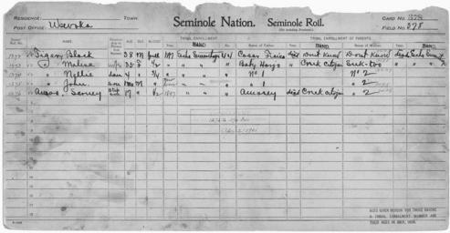| Keywords: Enrollment for Seminole Census Card 378 - NARA - 267952.tif Scope and content Name Sarney Amos Type By Blood Age 17 Sex Male Degree Indian Blood 1/2 Roll Number 1276 City of Residence ee Name Cosar Fixico Type Parent Sex Male Name Suktoo Type Parent Sex Female City of Residence ee Name Black Tiger Type By Blood Age 38 Sex Male Degree Indian Blood Full Roll Number 1272 City of Residence ee Name John Tiger Type By Blood Age 1 Sex Male Degree Indian Blood 3/4 Roll Number 1275 City of Residence ee Name Malesa Tiger Type By Blood Age 35 Sex Female Degree Indian Blood 1/2 Roll Number 1273 City of Residence ee Name Nellie Tiger Type By Blood Age 4 Sex Female Degree Indian Blood 3/4 Roll Number 1274 City of Residence ee General notes 267952 Local identifier 75-53A-SEMINOLE 378 Department of the Interior Office of Indian Affairs Office of the Commissioner to the Five Civilized Tribes 1893 - 1914 NARA's Southwest Region Fort Worth NRFA 1400 John Burgess Drive Fort Worth TX 76140 Record group Record Group 75 Records of the Bureau of Indian Affairs 1793 - 1999 Record group ARC 404 Enrollment Cards compiled 1898 - 1914 Series ARC 251747 File unit File unit ARC Variant control numbers NAIL Control Number NRFF-75-53A-23093<br /> NAIL Control Number NRFF-75-53A-31869<br /> NAIL Control Number NRFF-75-53A-48239<br /> NAIL Control Number NRFF-75-53A-49381<br /> NAIL Control Number NRFF-75-53A-49563<br /> NAIL Control Number NRFF-75-53A-49662<br /> NAIL Control Number NRFF-75-53A-49725<br /> NAIL Control Number NRFF-75-53A-SEMINOLE 378 yes Other versions <gallery> File Enrollment_for_Seminole_Census_Card_378_-_NARA_-_267952 tif tif File Enrollment_for_Seminole_Census_Card_378_-_NARA_-_267952 jpg jpg </gallery> NARA-cooperation PD-USGov Seminole census cards NARA TIF images with categorized JPGs |