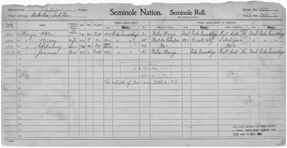 | Keywords: Enrollment for Seminole Census Card 392 - NARA - 267966.jpg Scope and content Name Mekko Chupco Type Parent Sex Male City of Residence Creek Name Fulhokke Type Parent Sex Female City of Residence ee Name Abler Harjo Type By Blood Age 24 Sex Male Degree Indian Blood Full Roll Number 1311 City of Residence ee Name Cheparney Harjo Type By Blood Age 1 Sex Male Degree Indian Blood 3/4 Roll Number 1313 City of Residence ee Name Jimmie Harjo Type By Blood Age 22 Sex Male Degree Indian Blood Full Roll Number 1314 City of Residence ee Name Neha Harjo Type Parent Sex Male City of Residence ee Name Wisey Harjo Type By Blood Age 22 Sex Female Degree Indian Blood 1/2 Roll Number 1312 City of Residence ee Name Satehigee Type Parent Sex Female City of Residence ee General notes 267966 Local identifier 75-53A-SEMINOLE 392 Department of the Interior Office of Indian Affairs Office of the Commissioner to the Five Civilized Tribes 1893 - 1914 NARA's Southwest Region Fort Worth NRFA 1400 John Burgess Drive Fort Worth TX 76140 Record group Record Group 75 Records of the Bureau of Indian Affairs 1793 - 1999 Record group ARC 404 Enrollment Cards compiled 1898 - 1914 Series ARC 251747 File unit File unit ARC Variant control numbers NAIL Control Number NRFF-75-53A-28119<br /> NAIL Control Number NRFF-75-53A-32702<br /> NAIL Control Number NRFF-75-53A-34025<br /> NAIL Control Number NRFF-75-53A-34175<br /> NAIL Control Number NRFF-75-53A-34491<br /> NAIL Control Number NRFF-75-53A-34828<br /> NAIL Control Number NRFF-75-53A-35296<br /> NAIL Control Number NRFF-75-53A-46032<br /> NAIL Control Number NRFF-75-53A-SEMINOLE 392 Other versions <gallery> File Enrollment_for_Seminole_Census_Card_392_-_NARA_-_267966 tif tif File Enrollment_for_Seminole_Census_Card_392_-_NARA_-_267966 jpg jpg </gallery> NARA-cooperation PD-USGov Seminole census cards |