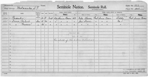 | Keywords: Enrollment for Seminole Census Card 411 - NARA - 267985.tif Scope and content Name Jim Davis Type Parent Sex Male City of Residence sb Name Moses Davis Type By Blood Age 16 Sex Male Degree Indian Blood Full Roll Number 1366 City of Residence sb Name Robert Davis Type By Blood Age 18 Sex Male Degree Indian Blood Full Roll Number 1365 City of Residence sb Name Leddy Type Parent Sex Female City of Residence sb Name Passake Type By Blood Age 50 Sex Female Degree Indian Blood Full Roll Number 1364 City of Residence sb Name Neha Thocco Type Parent Sex Male City of Residence sb General notes 267985 Local identifier 75-53A-SEMINOLE 411 Department of the Interior Office of Indian Affairs Office of the Commissioner to the Five Civilized Tribes 1893 - 1914 NARA's Southwest Region Fort Worth NRFA 1400 John Burgess Drive Fort Worth TX 76140 Record group Record Group 75 Records of the Bureau of Indian Affairs 1793 - 1999 Record group ARC 404 Enrollment Cards compiled 1898 - 1914 Series ARC 251747 File unit File unit ARC Variant control numbers NAIL Control Number NRFF-75-53A-29759<br /> NAIL Control Number NRFF-75-53A-29874<br /> NAIL Control Number NRFF-75-53A-29929<br /> NAIL Control Number NRFF-75-53A-39236<br /> NAIL Control Number NRFF-75-53A-43660<br /> NAIL Control Number NRFF-75-53A-49011<br /> NAIL Control Number NRFF-75-53A-SEMINOLE 411 yes Other versions <gallery> File Enrollment_for_Seminole_Census_Card_411_-_NARA_-_267985 tif tif File Enrollment_for_Seminole_Census_Card_411_-_NARA_-_267985 jpg jpg </gallery> NARA-cooperation PD-USGov Seminole census cards NARA TIF images with categorized JPGs |