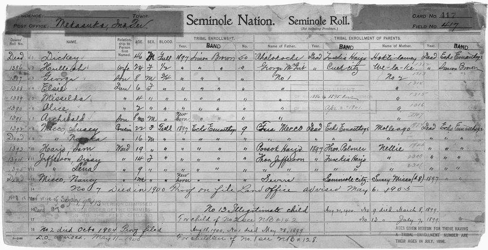 | Keywords: Enrollment for Seminole Census Card 417 - NARA - 267991.tif Scope and content Name Ahalokoche Type Parent Sex Male City of Residence th Name Alice Type By Blood Age 2 Sex Female Degree Indian Blood 3/4 Roll Number 1390 City of Residence sb Name Archibald Type By Blood Age 1 Sex Male Degree Indian Blood 3/4 Roll Number 1391 City of Residence sb Name Dickey Type By Blood Age 46 Sex Male Degree Indian Blood Full City of Residence sb Name Elsie Type By Blood Age 6 Sex Female Degree Indian Blood 3/4 Roll Number 1388 City of Residence sb Name George Type By Blood Age 8 Sex Male Degree Indian Blood 3/4 Roll Number 1387 City of Residence sb Name Possok Harjo Type Parent Sex Male City of Residence tp Name Sam Harjo Type By Blood Age 19 Sex Male Degree Indian Blood Full Roll Number 1393 City of Residence ee Name Hoktilamey Type Parent Sex Female City of Residence ee Name Hulleah Type By Blood Age 24 Sex Female Degree Indian Blood 1/2 Roll Number 1386 City of Residence sb Name Lena Jefferson Type By Blood Age 9 Sex Female Degree Indian Blood Full Roll Number 1395 City of Residence ee Name Sissy Jefferson Type By Blood Age 14 Sex Female Degree Indian Blood Full Roll Number 1394 City of Residence ee Name Thomas Jefferson Type Parent Sex Male City of Residence th Name George McGirt Type Parent Sex Male City of Residence Creek Name Fus Mecco Type Parent Sex Male City of Residence ee Name Nancy Micco Type By Blood Age 1 Sex Female Degree Indian Blood Full City of Residence ee Name Noska Micco Type By Blood Age 16 Sex Male Degree Indian Blood Full City of Residence ee Name Susey Micco Type By Blood Age 22 Sex Female Degree Indian Blood Full Roll Number 1392 City of Residence ee Name Misselda Type By Blood Age 4 Sex Female Degree Indian Blood 3/4 Roll Number 1389 City of Residence sb Name Molleago Type Parent Sex Female City of Residence ee Name Nellie Type Parent Sex Female City of Residence ee Name Welake Type Parent Sex Female City of Residence sb General notes 267991 Local identifier 75-53A-SEMINOLE 417 Department of the Interior Office of Indian Affairs Office of the Commissioner to the Five Civilized Tribes 1893 - 1914 NARA's Southwest Region Fort Worth NRFA 1400 John Burgess Drive Fort Worth TX 76140 Record group Record Group 75 Records of the Bureau of Indian Affairs 1793 - 1999 Record group ARC 404 Enrollment Cards compiled 1898 - 1914 Series ARC 251747 File unit File unit ARC Variant control numbers NAIL Control Number NRFF-75-53A-22807<br /> NAIL Control Number NRFF-75-53A-23016<br /> NAIL Control Number NRFF-75-53A-23336<br /> NAIL Control Number NRFF-75-53A-30410<br /> NAIL Control Number NRFF-75-53A-30843<br /> NAIL Control Number NRFF-75-53A-32868<br /> NAIL Control Number NRFF-75-53A-34996<br /> NAIL Control Number NRFF-75-53A-35022<br /> NAIL Control Number NRFF-75-53A-36511<br /> NAIL Control Number NRFF-75-53A-36888<br /> NAIL Control Number NRFF-75-53A-37491<br /> NAIL Control Number NRFF-75-53A-37509<br /> NAIL Control Number NRFF-75-53A-37515<br /> NAIL Control Number NRFF-75-53A-41172<br /> NAIL Control Number NRFF-75-53A-41721<br /> NAIL Control Number NRFF-75-53A-41906<br /> NAIL Control Number NRFF-75-53A-41911<br /> NAIL Control Number NRFF-75-53A-41928<br /> NAIL Control Number NRFF-75-53A-42265<br /> NAIL Control Number NRFF-75-53A-42371<br /> NAIL Control Number NRFF-75-53A-43043<br /> NAIL Control Number NRFF-75-53A-50945<br /> NAIL Control Number NRFF-75-53A-SEMINOLE 417 yes Other versions <gallery> File Enrollment_for_Seminole_Census_Card_417_-_NARA_-_267991 tif tif File Enrollment_for_Seminole_Census_Card_417_-_NARA_-_267991 jpg jpg </gallery> NARA-cooperation PD-USGov Seminole census cards NARA TIF images with categorized JPGs |