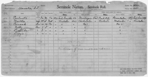 | Keywords: Enrollment for Seminole Census Card 451 - NARA - 268025.jpg Scope and content Name Chokoche Type Parent Sex Male City of Residence k Name Cunsah Type By Blood Age 10 Sex Male Degree Indian Blood 3/4 Roll Number 1521 City of Residence k Name Hesahaku Type Parent Sex Female City of Residence ee Name Lizzie Type By Blood Age 2 Sex Female Degree Indian Blood 3/4 Roll Number 1524 City of Residence k Name Lucinda Type By Blood Age 3 Sex Female Degree Indian Blood 3/4 Roll Number 1523 City of Residence k Name Malinda Type Parent Sex Female City of Residence k Name Martha Type By Blood Age 28 Sex Female Degree Indian Blood Full Roll Number 1520 City of Residence k Name Muskogee Type Parent Sex Male City of Residence Creek Name Nelly Type By Blood Age 7 Sex Female Degree Indian Blood 3/4 Roll Number 1522 City of Residence k Name Ponluste Type By Blood Age 30 Sex Male Degree Indian Blood 1/2 Roll Number 1519 City of Residence ee General notes 268025 Local identifier 75-53A-SEMINOLE 451 Department of the Interior Office of Indian Affairs Office of the Commissioner to the Five Civilized Tribes 1893 - 1914 NARA's Southwest Region Fort Worth NRFA 1400 John Burgess Drive Fort Worth TX 76140 Record group Record Group 75 Records of the Bureau of Indian Affairs 1793 - 1999 Record group ARC 404 Enrollment Cards compiled 1898 - 1914 Series ARC 251747 File unit File unit ARC Variant control numbers NAIL Control Number NRFF-75-53A-27986<br /> NAIL Control Number NRFF-75-53A-29396<br /> NAIL Control Number NRFF-75-53A-36154<br /> NAIL Control Number NRFF-75-53A-39658<br /> NAIL Control Number NRFF-75-53A-40125<br /> NAIL Control Number NRFF-75-53A-40338<br /> NAIL Control Number NRFF-75-53A-40738<br /> NAIL Control Number NRFF-75-53A-42866<br /> NAIL Control Number NRFF-75-53A-43046<br /> NAIL Control Number NRFF-75-53A-44357<br /> NAIL Control Number NRFF-75-53A-SEMINOLE 451 Other versions <gallery> File Enrollment_for_Seminole_Census_Card_451_-_NARA_-_268025 tif tif File Enrollment_for_Seminole_Census_Card_451_-_NARA_-_268025 jpg jpg </gallery> NARA-cooperation PD-USGov Seminole census cards |
