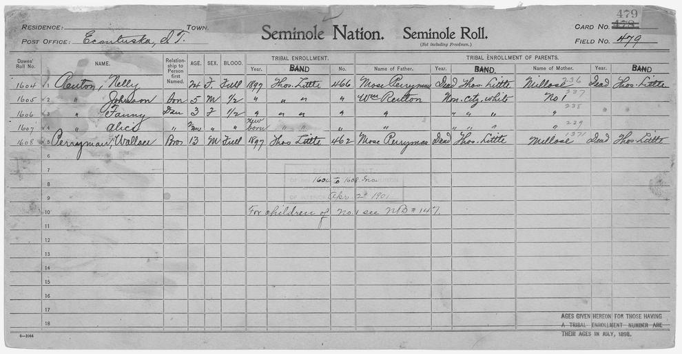 | Keywords: Enrollment for Seminole Census Card 479 - NARA - 268053.tif Scope and content Name Millose Type Parent Sex Female City of Residence tl Name Mose Perryman Type Parent Sex Male City of Residence tl Name Wallace Perryman Type By Blood Age 13 Sex Male Degree Indian Blood Full Roll Number 1608 City of Residence tl Name Alice Renton Type By Blood Age 1 Sex Female Degree Indian Blood 1/2 Roll Number 1607 City of Residence tl Name Fanny Renton Type By Blood Age 3 Sex Female Degree Indian Blood 1/2 Roll Number 1606 City of Residence tl Name Johnson Renton Type By Blood Age 5 Sex Male Degree Indian Blood 1/2 Roll Number 1605 City of Residence tl Name Nelly Renton Type By Blood Age 24 Sex Female Degree Indian Blood Full Roll Number 1604 City of Residence tl Name William Renton Type Parent Sex Male General notes 268053 Local identifier 75-53A-SEMINOLE 479 Department of the Interior Office of Indian Affairs Office of the Commissioner to the Five Civilized Tribes 1893 - 1914 NARA's Southwest Region Fort Worth NRFA 1400 John Burgess Drive Fort Worth TX 76140 Record group Record Group 75 Records of the Bureau of Indian Affairs 1793 - 1999 Record group ARC 404 Enrollment Cards compiled 1898 - 1914 Series ARC 251747 File unit File unit ARC Variant control numbers NAIL Control Number NRFF-75-53A-42171<br /> NAIL Control Number NRFF-75-53A-43927<br /> NAIL Control Number NRFF-75-53A-43990<br /> NAIL Control Number NRFF-75-53A-44935<br /> NAIL Control Number NRFF-75-53A-44936<br /> NAIL Control Number NRFF-75-53A-44937<br /> NAIL Control Number NRFF-75-53A-44938<br /> NAIL Control Number NRFF-75-53A-44939<br /> NAIL Control Number NRFF-75-53A-SEMINOLE 479 yes Other versions <gallery> File Enrollment_for_Seminole_Census_Card_479_-_NARA_-_268053 tif tif File Enrollment_for_Seminole_Census_Card_479_-_NARA_-_268053 jpg jpg </gallery> NARA-cooperation PD-USGov Seminole census cards NARA TIF images with categorized JPGs |