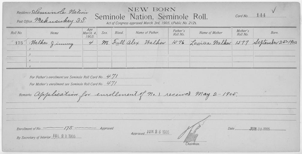 | Keywords: Enrollment for Seminole Census Card 144 - NARA - 267718.tif Scope and content Name Edmond Factor Type By Blood Age 5 Sex Male Degree Indian Blood 3/4 Roll Number 499 City of Residence tp Name Josey Factor Type By Blood Age 1 Sex Male Degree Indian Blood 3/4 Roll Number 500 City of Residence tp Name June Factor Type By Blood Age 25 Sex Male Degree Indian Blood Full Roll Number 497 City of Residence ee Name Lizzie Factor Type By Blood Age 27 Sex Female Degree Indian Blood 1/2 Roll Number 498 City of Residence tp Name Madelia Type Parent Sex Female City of Residence tp Name Jack Palmer Type Parent Sex Male City of Residence Creek Name Parsaka Type Parent Sex Male City of Residence o Name Sally Type Parent Sex Female City of Residence ee Name Jimmy Walker Type Newborn Age 4 Sex Male Degree Indian Blood FULL Roll Number 175 Post Office Mekusukey General notes 267718 Local identifier 75-53A-SEMINOLE 144 Department of the Interior Office of Indian Affairs Office of the Commissioner to the Five Civilized Tribes 1893 - 1914 NARA's Southwest Region Fort Worth NRFA 1400 John Burgess Drive Fort Worth TX 76140 Record group Record Group 75 Records of the Bureau of Indian Affairs 1793 - 1999 Record group ARC 404 Enrollment Cards compiled 1898 - 1914 Series ARC 251747 File unit File unit ARC Variant control numbers NAIL Control Number NRFF-75-53A-31176<br /> NAIL Control Number NRFF-75-53A-31224<br /> NAIL Control Number NRFF-75-53A-31225<br /> NAIL Control Number NRFF-75-53A-31233<br /> NAIL Control Number NRFF-75-53A-40284<br /> NAIL Control Number NRFF-75-53A-43508<br /> NAIL Control Number NRFF-75-53A-43624<br /> NAIL Control Number NRFF-75-53A-45629<br /> NAIL Control Number NRFF-75-53A-52730<br /> NAIL Control Number NRFF-75-53A-SEMINOLE 144 yes Other versions <gallery> File Enrollment_for_Seminole_Census_Card_144_-_NARA_-_267718 tif tif File Enrollment_for_Seminole_Census_Card_144_-_NARA_-_267718 jpg jpg </gallery> NARA-cooperation PD-USGov Cherokee census cards NARA TIF images with categorized JPGs |