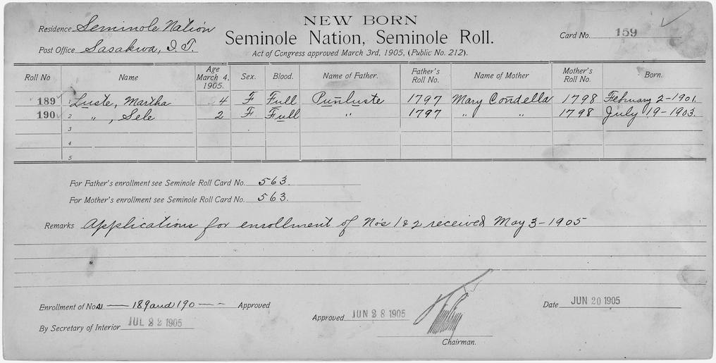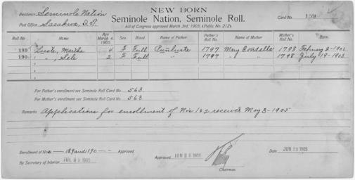 Keywords: Enrollment for Seminole Census Card 159 - NARA - 267733.tif Scope and content Name Capiche Type Parent Sex Male City of Residence Creek Name Louis Coker Type Parent Sex Male City of Residence Creek Name Eufaula Type Parent Sex Male City of Residence tp Name Jannati Type By Blood Age 10 Sex Female Degree Indian Blood 3/4 Roll Number 556 City of Residence tp Name Rhoda Natukse Type By Blood Age 28 Sex Female Degree Indian Blood 1/2 Roll Number 555 City of Residence tp Name Sukey Natukse Type By Blood Age 45 Sex Female Degree Indian Blood AW Roll Number 554 City of Residence tp Name Notshpyer Type Parent Sex Female City of Residence Creek Name Lucy Reed Type By Blood Age 1 Sex Female Degree Indian Blood 1/2 Roll Number 558 City of Residence tp Name Walter Reed Type Parent Sex Male City of Residence Creek Name Rosana Type By Blood Age 5 Sex Female Degree Indian Blood 1/4 Roll Number 557 City of Residence tp Name Martha Luste Type Newborn Age 4 Sex Female Degree Indian Blood FULL Roll Number 189 Post Office Sasakwa Name Sele Luste Type Newborn Age 2 Sex Female Degree Indian Blood FULL Roll Number 190 Post Office Sasakwa General notes 267733 Local identifier 75-53A-SEMINOLE 159 Department of the Interior Office of Indian Affairs Office of the Commissioner to the Five Civilized Tribes 1893 - 1914 NARA's Southwest Region Fort Worth NRFA 1400 John Burgess Drive Fort Worth TX 76140 Record group Record Group 75 Records of the Bureau of Indian Affairs 1793 - 1999 Record group ARC 404 Enrollment Cards compiled 1898 - 1914 Series ARC 251747 File unit File unit ARC Variant control numbers NAIL Control Number NRFF-75-53A-27100<br /> NAIL Control Number NRFF-75-53A-28477<br /> NAIL Control Number NRFF-75-53A-31099<br /> NAIL Control Number NRFF-75-53A-37471<br /> NAIL Control Number NRFF-75-53A-43002<br /> NAIL Control Number NRFF-75-53A-43003<br /> NAIL Control Number NRFF-75-53A-43319<br /> NAIL Control Number NRFF-75-53A-44903<br /> NAIL Control Number NRFF-75-53A-44919<br /> NAIL Control Number NRFF-75-53A-45420<br /> NAIL Control Number NRFF-75-53A-52756<br /> NAIL Control Number NRFF-75-53A-52757<br /> NAIL Control Number NRFF-75-53A-SEMINOLE 159 yes Other versions <gallery> File Enrollment_for_Seminole_Census_Card_159_-_NARA_-_267733 tif tif File Enrollment_for_Seminole_Census_Card_159_-_NARA_-_267733 jpg jpg </gallery> NARA-cooperation PD-USGov Cherokee census cards NARA TIF images with categorized JPGs |