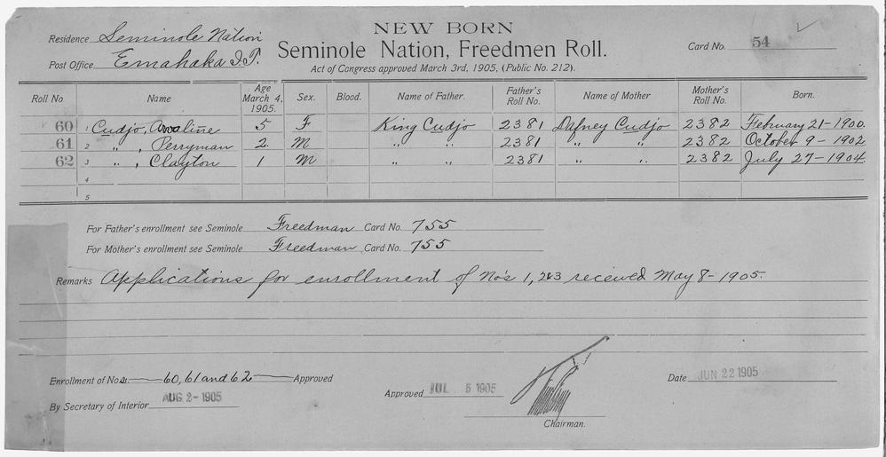 | Keywords: Enrollment for Seminole Census Card 54 - NARA - 267628.tif Scope and content Name Dillsa Type By Blood Age 13 Sex Female Degree Indian Blood Full Roll Number 199 City of Residence th Name George Type By Blood Age 18 Sex Male Degree Indian Blood Full Roll Number 197 City of Residence th Name Parsuk Harjoche Type Parent Sex Male City of Residence th Name Liddy Type Parent Sex Female City of Residence th Name Mulcy Type Parent Sex Female City of Residence th Name Mulgusse Type By Blood Age 1 Sex Male Degree Indian Blood Full Roll Number 200 City of Residence th Name Nocosee Type Parent Sex Male City of Residence tp Name Omayaye Type By Blood Age 30 Sex Female Degree Indian Blood Full Roll Number 198 City of Residence th Name Parnoce Type Parent Sex Male City of Residence tp Name Arvaline Cudjo Type Newborn Freedmen-Rejected Age 5 Sex Female Degree Indian Blood Not Reported Roll Number 60 Post Office Emahaka Name Perryman Cudjo Type Newborn Freedmen-Rejected Age 2 Sex Male Degree Indian Blood Not Reported Roll Number 61 Post Office Emahaka Name Clayton Cudjo Type Newborn Freedmen-Rejected Age 1 Sex Male Degree Indian Blood Not Reported Roll Number 62 Post Office Emahaka General notes 267628 Local identifier 75-53A-SEMINOLE 54 Department of the Interior Office of Indian Affairs Office of the Commissioner to the Five Civilized Tribes 1893 - 1914 NARA's Southwest Region Fort Worth NRFA 1400 John Burgess Drive Fort Worth TX 76140 Record group Record Group 75 Records of the Bureau of Indian Affairs 1793 - 1999 Record group ARC 404 Enrollment Cards compiled 1898 - 1914 Series ARC 251747 File unit File unit ARC Variant control numbers NAIL Control Number NRFF-75-53A-30420<br /> NAIL Control Number NRFF-75-53A-32865<br /> NAIL Control Number NRFF-75-53A-35396<br /> NAIL Control Number NRFF-75-53A-39452<br /> NAIL Control Number NRFF-75-53A-42750<br /> NAIL Control Number NRFF-75-53A-42753<br /> NAIL Control Number NRFF-75-53A-43239<br /> NAIL Control Number NRFF-75-53A-43404<br /> NAIL Control Number NRFF-75-53A-43594<br /> NAIL Control Number NRFF-75-53A-52886<br /> NAIL Control Number NRFF-75-53A-52887<br /> NAIL Control Number NRFF-75-53A-52888<br /> NAIL Control Number NRFF-75-53A-SEMINOLE 54 yes Other versions <gallery> File Enrollment_for_Seminole_Census_Card_54_-_NARA_-_267628 tif tif File Enrollment_for_Seminole_Census_Card_54_-_NARA_-_267628 jpg jpg </gallery> NARA-cooperation PD-USGov Cherokee census cards Seminole census cards NARA TIF images with categorized JPGs |