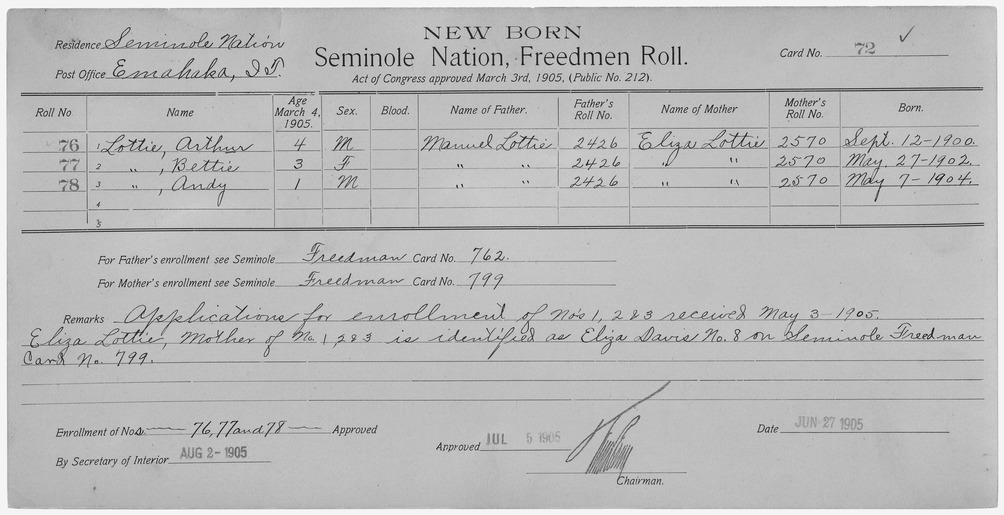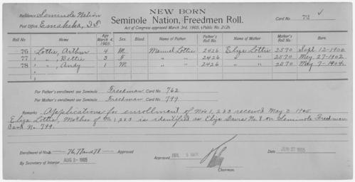 Keywords: Enrollment for Seminole Census Card 72 - NARA - 267646.tif Scope and content Name Hobaye Bam Type Parent Sex Male City of Residence Creek Name Liddey Type Parent Sex Female City of Residence e Name Madelia Type Parent Sex Female City of Residence tp Name Jack Palmer Type Parent Sex Male City of Residence Creek Name Jim Palmer Type By Blood Age 17 Sex Male Degree Indian Blood 1/2 Roll Number 266 City of Residence e Name Legus Palmer Type By Blood Age 6 Sex Male Degree Indian Blood 3/4 Roll Number 265 City of Residence e Name Sarney Palmer Type By Blood Age 13 Sex Male Degree Indian Blood 3/4 Roll Number 262 City of Residence e Name Thomas Palmer Type By Blood Age 39 Sex Male Degree Indian Blood 1/2 Roll Number 261 City of Residence tp Name Willey Palmer Type By Blood Age 11 Sex Male Degree Indian Blood 3/4 Roll Number 263 City of Residence e Name Wilsey Palmer Type By Blood Age 9 Sex Male Degree Indian Blood 3/4 Roll Number 264 City of Residence e Name Arthur Lottie Type Newborn Freedmen-Rejected Age 4 Sex Male Degree Indian Blood Not Reported Roll Number 76 Post Office Emahaka Name Bettie Lottie Type Newborn Freedmen-Rejected Age 3 Sex Female Degree Indian Blood Not Reported Roll Number 77 Post Office Emahaka Name Andy Lottie Type Newborn Freedmen-Rejected Age 1 Sex Male Degree Indian Blood Not Reported Roll Number 78 Post Office Emahaka General notes 267646 Local identifier 75-53A-SEMINOLE 72 Department of the Interior Office of Indian Affairs Office of the Commissioner to the Five Civilized Tribes 1893 - 1914 NARA's Southwest Region Fort Worth NRFA 1400 John Burgess Drive Fort Worth TX 76140 Record group Record Group 75 Records of the Bureau of Indian Affairs 1793 - 1999 Record group ARC 404 Enrollment Cards compiled 1898 - 1914 Series ARC 251747 File unit File unit ARC Variant control numbers NAIL Control Number NRFF-75-53A-23687<br /> NAIL Control Number NRFF-75-53A-39445<br /> NAIL Control Number NRFF-75-53A-40281<br /> NAIL Control Number NRFF-75-53A-43507<br /> NAIL Control Number NRFF-75-53A-43514<br /> NAIL Control Number NRFF-75-53A-43517<br /> NAIL Control Number NRFF-75-53A-43528<br /> NAIL Control Number NRFF-75-53A-43534<br /> NAIL Control Number NRFF-75-53A-43538<br /> NAIL Control Number NRFF-75-53A-43539<br /> NAIL Control Number NRFF-75-53A-52911<br /> NAIL Control Number NRFF-75-53A-52912<br /> NAIL Control Number NRFF-75-53A-52913<br /> NAIL Control Number NRFF-75-53A-SEMINOLE 72 yes Other versions <gallery> File Enrollment_for_Seminole_Census_Card_72_-_NARA_-_267646 tif tif File Enrollment_for_Seminole_Census_Card_72_-_NARA_-_267646 jpg jpg </gallery> NARA-cooperation PD-USGov Cherokee census cards Seminole census cards NARA TIF images with categorized JPGs |