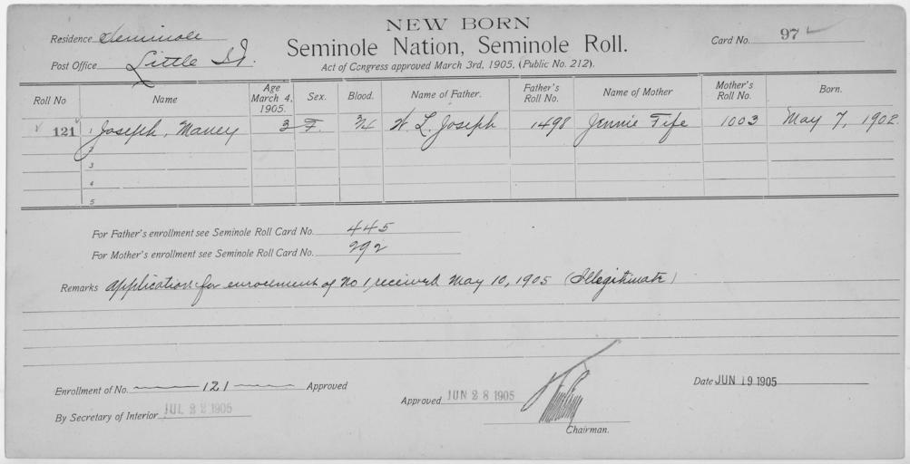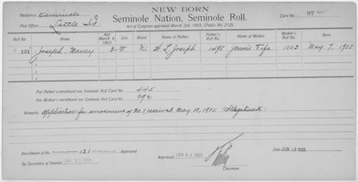 | Keywords: Enrollment for Seminole Census Card 97 - NARA - 267671.jpg  Scope and content Name Hoktoke Type By Blood Age 14 Sex Female Degree Indian Blood Full Roll Number 341 City of Residence tp Name Itchkanaaha Type Parent Sex Female City of Residence tp Name Jannie Type By Blood Age 55 Sex Female Degree Indian Blood Full Roll Number 339 City of Residence o Name Josey Type By Blood Age 8 Sex Male Degree Indian Blood Full Roll Number 342 City of Residence tp Name Ponnokee Type By Blood Age 45 Sex Male Degree Indian Blood Full Roll Number 338 City of Residence th Name Sefah Type By Blood Age 18 Sex Male Degree Indian Blood Full Roll Number 340 City of Residence tp Name Maney Joseph Type Newborn Age 3 Sex Female Degree Indian Blood 3/4 Roll Number 121 Post Office Little General notes 267671 Local identifier 75-53A-SEMINOLE 97 Department of the Interior Office of Indian Affairs Office of the Commissioner to the Five Civilized Tribes 1893 - 1914 NARA's Southwest Region Fort Worth NRFA 1400 John Burgess Drive Fort Worth TX 76140 Record group Record Group 75 Records of the Bureau of Indian Affairs 1793 - 1999 Record group ARC 404 Enrollment Cards compiled 1898 - 1914 Series ARC 251747 File unit File unit ARC Variant control numbers NAIL Control Number NRFF-75-53A-36520<br /> NAIL Control Number NRFF-75-53A-37219<br /> NAIL Control Number NRFF-75-53A-37472<br /> NAIL Control Number NRFF-75-53A-38180<br /> NAIL Control Number NRFF-75-53A-44358<br /> NAIL Control Number NRFF-75-53A-46434<br /> NAIL Control Number NRFF-75-53A-52663<br /> NAIL Control Number NRFF-75-53A-SEMINOLE 97 Other versions <gallery> File Enrollment_for_Seminole_Census_Card_97_-_NARA_-_267671 tif tif File Enrollment_for_Seminole_Census_Card_97_-_NARA_-_267671 jpg jpg </gallery> NARA-cooperation PD-USGov Cherokee census cards |