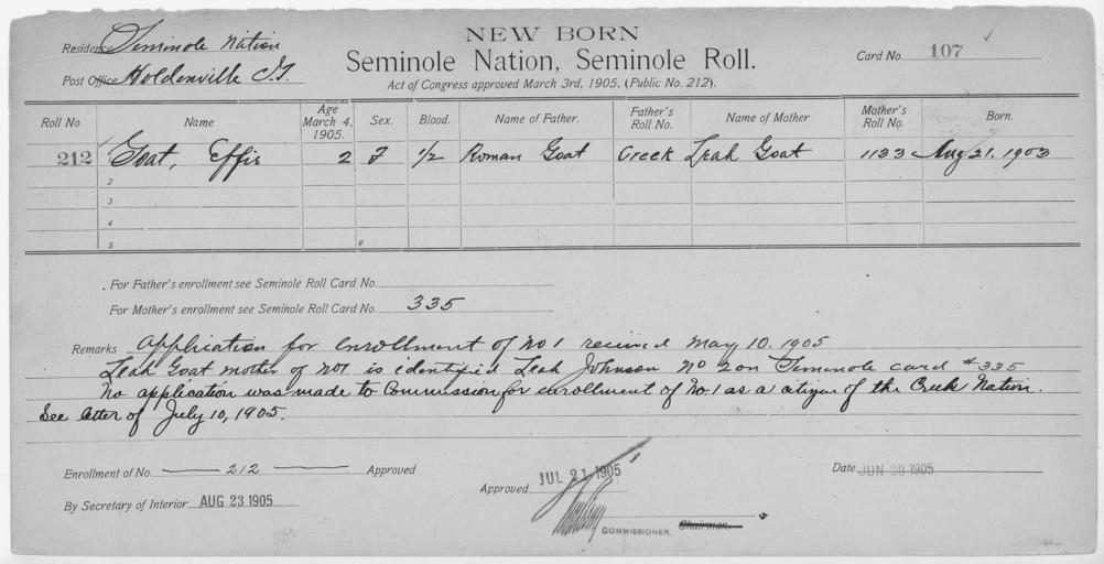| Keywords: Enrollment for Seminole Census Card 107 - NARA - 267681.jpg Scope and content Name Artus Harjo Type Parent Sex Male City of Residence th Name Jinsey Harjo Type By Blood Age 1 Sex Male Degree Indian Blood Full Roll Number 376 City of Residence yh Name Nocos Harjo Type Parent Sex Male City of Residence th Name Siah Harjo Type By Blood Age 20 Sex Male Degree Indian Blood Full Roll Number 374 City of Residence th Name Wannie Harjo Type By Blood Age 18 Sex Female Degree Indian Blood Full Roll Number 375 City of Residence yh Name Hepsy Type Parent Sex Female City of Residence yh Name Ispechee Type Parent Sex Female City of Residence th Name Effie Goat Type Newborn Age 2 Sex Female Degree Indian Blood 1/2 Roll Number 212 Post Office Holdenville General notes 267681 Local identifier 75-53A-SEMINOLE 107 Department of the Interior Office of Indian Affairs Office of the Commissioner to the Five Civilized Tribes 1893 - 1914 NARA's Southwest Region Fort Worth NRFA 1400 John Burgess Drive Fort Worth TX 76140 Record group Record Group 75 Records of the Bureau of Indian Affairs 1793 - 1999 Record group ARC 404 Enrollment Cards compiled 1898 - 1914 Series ARC 251747 File unit File unit ARC Variant control numbers NAIL Control Number NRFF-75-53A-34106<br /> NAIL Control Number NRFF-75-53A-34499<br /> NAIL Control Number NRFF-75-53A-34841<br /> NAIL Control Number NRFF-75-53A-35049<br /> NAIL Control Number NRFF-75-53A-35255<br /> NAIL Control Number NRFF-75-53A-36116<br /> NAIL Control Number NRFF-75-53A-37201<br /> NAIL Control Number NRFF-75-53A-52677<br /> NAIL Control Number NRFF-75-53A-SEMINOLE 107 Other versions <gallery> File Enrollment_for_Seminole_Census_Card_107_-_NARA_-_267681 tif tif File Enrollment_for_Seminole_Census_Card_107_-_NARA_-_267681 jpg jpg </gallery> NARA-cooperation PD-USGov Cherokee census cards |