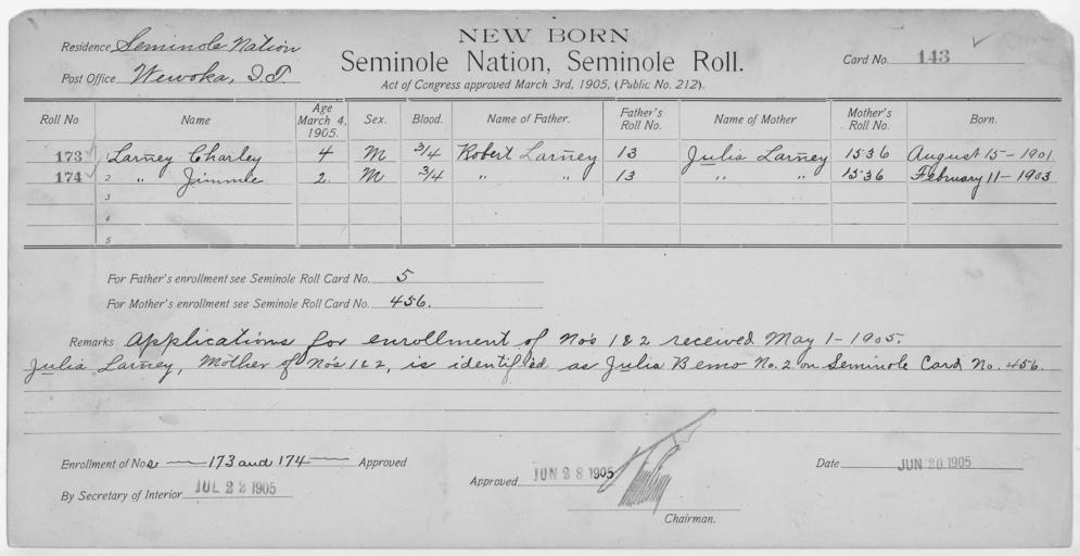 | Keywords: Enrollment for Seminole Census Card 143 - NARA - 267717.jpg  Scope and content Name Polly Chupco Type By Blood Age 34 Sex Female Degree Indian Blood Full Roll Number 495 City of Residence yh Name Sammy Chupco Type By Blood Age 33 Sex Male Degree Indian Blood Full Roll Number 494 City of Residence th Name Wiley Chupco Type By Blood Age 16 Sex Male Degree Indian Blood Full Roll Number 496 City of Residence th Name Hohkote Type Parent Sex Female City of Residence th Name Chepon Hutke Type Parent Sex Male City of Residence wc Name Sigey Type Parent Sex Female City of Residence yh Name Woxie Yaholar Type Parent Sex Male City of Residence yh Name Charley Larney Type Newborn Age 4 Sex Male Degree Indian Blood 3/4 Roll Number 173 Post Office Wewoka Name Jimmie Larney Type Newborn Age 2 Sex Male Degree Indian Blood 3/4 Roll Number 174 Post Office Wewoka General notes 267717 Local identifier 75-53A-SEMINOLE 143 Department of the Interior Office of Indian Affairs Office of the Commissioner to the Five Civilized Tribes 1893 - 1914 NARA's Southwest Region Fort Worth NRFA 1400 John Burgess Drive Fort Worth TX 76140 Record group Record Group 75 Records of the Bureau of Indian Affairs 1793 - 1999 Record group ARC 404 Enrollment Cards compiled 1898 - 1914 Series ARC 251747 File unit File unit ARC Variant control numbers NAIL Control Number NRFF-75-53A-28145<br /> NAIL Control Number NRFF-75-53A-28149<br /> NAIL Control Number NRFF-75-53A-28171<br /> NAIL Control Number NRFF-75-53A-36477<br /> NAIL Control Number NRFF-75-53A-36972<br /> NAIL Control Number NRFF-75-53A-46824<br /> NAIL Control Number NRFF-75-53A-52339<br /> NAIL Control Number NRFF-75-53A-52728<br /> NAIL Control Number NRFF-75-53A-52729<br /> NAIL Control Number NRFF-75-53A-SEMINOLE 143 Other versions <gallery> File Enrollment_for_Seminole_Census_Card_143_-_NARA_-_267717 tif tif File Enrollment_for_Seminole_Census_Card_143_-_NARA_-_267717 jpg jpg </gallery> NARA-cooperation PD-USGov Cherokee census cards |