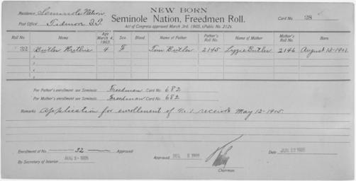 Keywords: Enrollment for Seminole Census Card 28 - NARA - 267602.jpg Scope and content Name Chaney Type Parent Sex Female City of Residence th Name Eliza Factor Type Parent Sex Female City of Residence ee Name Ella Factor Type By Blood Age 30 Sex Female Degree Indian Blood Full Roll Number 110 City of Residence th Name Isaac Factor Type By Blood Age 10 Sex Male Degree Indian Blood Full Roll Number 111 City of Residence th Name James Factor Type Parent Sex Male City of Residence tp Name Joseph Factor Type By Blood Age 3 Sex Male Degree Indian Blood Full Roll Number 114 City of Residence th Name Leah Factor Type By Blood Age 5 Sex Female Degree Indian Blood Full Roll Number 113 City of Residence th Name Martha Factor Type By Blood Age 7 Sex Female Degree Indian Blood Full Roll Number 112 City of Residence th Name Minerva Factor Type By Blood Age 1 Sex Female Degree Indian Blood Full Roll Number 115 City of Residence th Name Thomas Factor Type By Blood Age 45 Sex Male Degree Indian Blood Full Roll Number 109 City of Residence tp Name Green Stalk Type Parent Sex Male City of Residence tp Name Ruthie Butler Type Newborn Freedmen-Rejected Age 4 Sex Female Degree Indian Blood Not Reported Roll Number 32 Post Office Tidmore General notes 267602 Local identifier 75-53A-SEMINOLE 28 Department of the Interior Office of Indian Affairs Office of the Commissioner to the Five Civilized Tribes 1893 - 1914 NARA's Southwest Region Fort Worth NRFA 1400 John Burgess Drive Fort Worth TX 76140 Record group Record Group 75 Records of the Bureau of Indian Affairs 1793 - 1999 Record group ARC 404 Enrollment Cards compiled 1898 - 1914 Series ARC 251747 File unit File unit ARC Variant control numbers NAIL Control Number NRFF-75-53A-27429<br /> NAIL Control Number NRFF-75-53A-31180<br /> NAIL Control Number NRFF-75-53A-31181<br /> NAIL Control Number NRFF-75-53A-31192<br /> NAIL Control Number NRFF-75-53A-31194<br /> NAIL Control Number NRFF-75-53A-31223<br /> NAIL Control Number NRFF-75-53A-31227<br /> NAIL Control Number NRFF-75-53A-31238<br /> NAIL Control Number NRFF-75-53A-31242<br /> NAIL Control Number NRFF-75-53A-31261<br /> NAIL Control Number NRFF-75-53A-47783<br /> NAIL Control Number NRFF-75-53A-52843<br /> NAIL Control Number NRFF-75-53A-SEMINOLE 28 Other versions <gallery> File Enrollment_for_Seminole_Census_Card_28_-_NARA_-_267602 tif tif File Enrollment_for_Seminole_Census_Card_28_-_NARA_-_267602 jpg jpg </gallery> NARA-cooperation PD-USGov Cherokee census cards Seminole census cards |