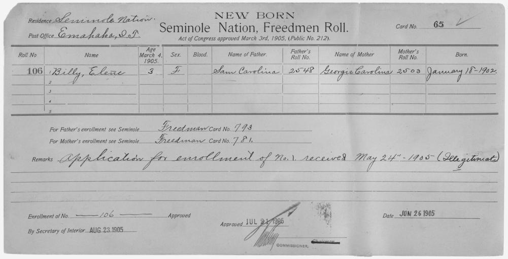 | Keywords: Enrollment for Seminole Census Card 65 - NARA - 267639.jpg Scope and content Name Amos Type By Blood Age 7 Sex Male Degree Indian Blood Full Roll Number 243 City of Residence th Name Chucoluse Type Parent Sex Male City of Residence th Name Hodulga Fixico Type Parent Sex Male City of Residence ee Name Hoktochee Type By Blood Age 38 Sex Female Degree Indian Blood Full Roll Number 240 City of Residence th Name Hulchoke Type Parent Sex Female Name Thomas Jefferson Type By Blood Age 37 Sex Male Degree Indian Blood Full Roll Number 239 City of Residence th Name Sammah Type By Blood Age 25 Sex Male Degree Indian Blood Full Roll Number 241 City of Residence th Name Selgah Type Parent Sex Female City of Residence th Name Williamse Type By Blood Age 21 Sex Male Degree Indian Blood Full Roll Number 242 City of Residence th Name Woxie Yoholar Type Parent Sex Male City of Residence yh Name Elene Billy Type Newborn Freedmen-Rejected Age 3 Sex Female Degree Indian Blood Not Reported Roll Number 106 Post Office Emahaka General notes 267639 Local identifier 75-53A-SEMINOLE 65 Department of the Interior Office of Indian Affairs Office of the Commissioner to the Five Civilized Tribes 1893 - 1914 NARA's Southwest Region Fort Worth NRFA 1400 John Burgess Drive Fort Worth TX 76140 Record group Record Group 75 Records of the Bureau of Indian Affairs 1793 - 1999 Record group ARC 404 Enrollment Cards compiled 1898 - 1914 Series ARC 251747 File unit File unit ARC Variant control numbers NAIL Control Number NRFF-75-53A-23089<br /> NAIL Control Number NRFF-75-53A-28026<br /> NAIL Control Number NRFF-75-53A-31914<br /> NAIL Control Number NRFF-75-53A-36517<br /> NAIL Control Number NRFF-75-53A-36881<br /> NAIL Control Number NRFF-75-53A-37512<br /> NAIL Control Number NRFF-75-53A-45657<br /> NAIL Control Number NRFF-75-53A-46576<br /> NAIL Control Number NRFF-75-53A-51457<br /> NAIL Control Number NRFF-75-53A-52583<br /> NAIL Control Number NRFF-75-53A-52903<br /> NAIL Control Number NRFF-75-53A-SEMINOLE 65 Other versions <gallery> File Enrollment_for_Seminole_Census_Card_65_-_NARA_-_267639 tif tif File Enrollment_for_Seminole_Census_Card_65_-_NARA_-_267639 jpg jpg </gallery> NARA-cooperation PD-USGov Cherokee census cards Seminole census cards |
