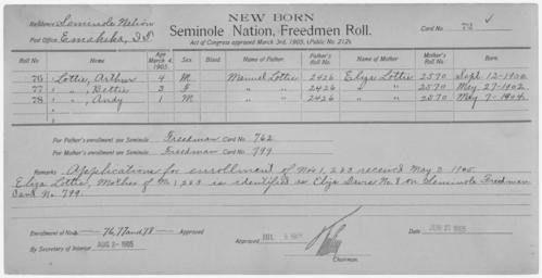 Keywords: Enrollment for Seminole Census Card 72 - NARA - 267646.jpg Scope and content Name Hobaye Bam Type Parent Sex Male City of Residence Creek Name Liddey Type Parent Sex Female City of Residence e Name Madelia Type Parent Sex Female City of Residence tp Name Jack Palmer Type Parent Sex Male City of Residence Creek Name Jim Palmer Type By Blood Age 17 Sex Male Degree Indian Blood 1/2 Roll Number 266 City of Residence e Name Legus Palmer Type By Blood Age 6 Sex Male Degree Indian Blood 3/4 Roll Number 265 City of Residence e Name Sarney Palmer Type By Blood Age 13 Sex Male Degree Indian Blood 3/4 Roll Number 262 City of Residence e Name Thomas Palmer Type By Blood Age 39 Sex Male Degree Indian Blood 1/2 Roll Number 261 City of Residence tp Name Willey Palmer Type By Blood Age 11 Sex Male Degree Indian Blood 3/4 Roll Number 263 City of Residence e Name Wilsey Palmer Type By Blood Age 9 Sex Male Degree Indian Blood 3/4 Roll Number 264 City of Residence e Name Arthur Lottie Type Newborn Freedmen-Rejected Age 4 Sex Male Degree Indian Blood Not Reported Roll Number 76 Post Office Emahaka Name Bettie Lottie Type Newborn Freedmen-Rejected Age 3 Sex Female Degree Indian Blood Not Reported Roll Number 77 Post Office Emahaka Name Andy Lottie Type Newborn Freedmen-Rejected Age 1 Sex Male Degree Indian Blood Not Reported Roll Number 78 Post Office Emahaka General notes 267646 Local identifier 75-53A-SEMINOLE 72 Department of the Interior Office of Indian Affairs Office of the Commissioner to the Five Civilized Tribes 1893 - 1914 NARA's Southwest Region Fort Worth NRFA 1400 John Burgess Drive Fort Worth TX 76140 Record group Record Group 75 Records of the Bureau of Indian Affairs 1793 - 1999 Record group ARC 404 Enrollment Cards compiled 1898 - 1914 Series ARC 251747 File unit File unit ARC Variant control numbers NAIL Control Number NRFF-75-53A-23687<br /> NAIL Control Number NRFF-75-53A-39445<br /> NAIL Control Number NRFF-75-53A-40281<br /> NAIL Control Number NRFF-75-53A-43507<br /> NAIL Control Number NRFF-75-53A-43514<br /> NAIL Control Number NRFF-75-53A-43517<br /> NAIL Control Number NRFF-75-53A-43528<br /> NAIL Control Number NRFF-75-53A-43534<br /> NAIL Control Number NRFF-75-53A-43538<br /> NAIL Control Number NRFF-75-53A-43539<br /> NAIL Control Number NRFF-75-53A-52911<br /> NAIL Control Number NRFF-75-53A-52912<br /> NAIL Control Number NRFF-75-53A-52913<br /> NAIL Control Number NRFF-75-53A-SEMINOLE 72 Other versions <gallery> File Enrollment_for_Seminole_Census_Card_72_-_NARA_-_267646 tif tif File Enrollment_for_Seminole_Census_Card_72_-_NARA_-_267646 jpg jpg </gallery> NARA-cooperation PD-USGov Cherokee census cards Seminole census cards |