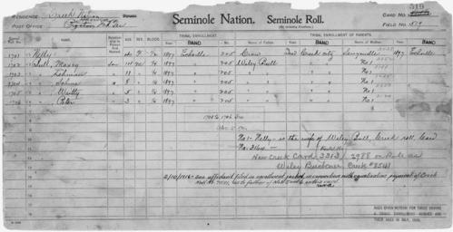 | Keywords: Enrollment for Seminole Census Card 519 - NARA - 268093.tif Scope and content Name Lehman Bull Type By Blood Age 11 Sex Male Degree Indian Blood 1/4 Roll Number 1703 City of Residence e Name Maxey Bull Type By Blood Age 14 Sex Male Degree Indian Blood 1/4 Roll Number 1702 City of Residence e Name Peter Bull Type By Blood Age 3 Sex Male Degree Indian Blood 1/4 Roll Number 1706 City of Residence e Name Sohma Bull Type By Blood Age 8 Sex Male Degree Indian Blood 1/4 Roll Number 1704 City of Residence e Name Waitty Bull Type By Blood Age 5 Sex Male Degree Indian Blood 1/4 Roll Number 1705 City of Residence e Name Wiley Bull Type Parent Sex Male City of Residence Creek Name Nelly Type By Blood Age 40 Sex Female Degree Indian Blood 1/2 Roll Number 1701 City of Residence e Name Senyouille Type Parent Sex Female City of Residence e General notes 268093 Local identifier 75-53A-SEMINOLE 519 Department of the Interior Office of Indian Affairs Office of the Commissioner to the Five Civilized Tribes 1893 - 1914 NARA's Southwest Region Fort Worth NRFA 1400 John Burgess Drive Fort Worth TX 76140 Record group Record Group 75 Records of the Bureau of Indian Affairs 1793 - 1999 Record group ARC 404 Enrollment Cards compiled 1898 - 1914 Series ARC 251747 File unit File unit ARC Variant control numbers NAIL Control Number NRFF-75-53A-26586<br /> NAIL Control Number NRFF-75-53A-26587<br /> NAIL Control Number NRFF-75-53A-26588<br /> NAIL Control Number NRFF-75-53A-26589<br /> NAIL Control Number NRFF-75-53A-26590<br /> NAIL Control Number NRFF-75-53A-26591<br /> NAIL Control Number NRFF-75-53A-43047<br /> NAIL Control Number NRFF-75-53A-46624<br /> NAIL Control Number NRFF-75-53A-SEMINOLE 519 yes Other versions <gallery> File Enrollment_for_Seminole_Census_Card_519_-_NARA_-_268093 tif tif File Enrollment_for_Seminole_Census_Card_519_-_NARA_-_268093 jpg jpg </gallery> NARA-cooperation PD-USGov Seminole census cards NARA TIF images with categorized JPGs |