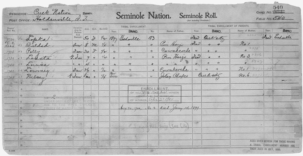 | Keywords: Enrollment for Seminole Census Card 540 - NARA - 268114.tif Scope and content Name Bildad Type By Blood Age 8 Sex Male Degree Indian Blood 1/4 City of Residence e Name Jikey Chupco Type Parent Sex Male City of Residence Creek Name Cowakcoche Type Parent Sex Male City of Residence Creek Name Pin Harjo Type Parent Sex Male City of Residence Creek Name Loasta Type By Blood Age 7 Sex Female Degree Indian Blood 1/4 Roll Number 1739 City of Residence e Name Lopka Type By Blood Age 50 Sex Female Degree Indian Blood 1/2 Roll Number 1737 City of Residence e Name Louisa Type By Blood Age 4 Sex Female Degree Indian Blood 1/4 Roll Number 1740 City of Residence e Name Lowiney Type By Blood Age 26 Sex Female Degree Indian Blood 1/2 Roll Number 1741 City of Residence e Name Nelsey Type By Blood Age 1 Sex Female Degree Indian Blood 1/4 Roll Number 1742 City of Residence e Name Polly Type By Blood Age 30 Sex Female Degree Indian Blood 1/2 Roll Number 1738 City of Residence e General notes 268114 Local identifier 75-53A-SEMINOLE 540 Department of the Interior Office of Indian Affairs Office of the Commissioner to the Five Civilized Tribes 1893 - 1914 NARA's Southwest Region Fort Worth NRFA 1400 John Burgess Drive Fort Worth TX 76140 Record group Record Group 75 Records of the Bureau of Indian Affairs 1793 - 1999 Record group ARC 404 Enrollment Cards compiled 1898 - 1914 Series ARC 251747 File unit File unit ARC Variant control numbers NAIL Control Number NRFF-75-53A-25088<br /> NAIL Control Number NRFF-75-53A-28086<br /> NAIL Control Number NRFF-75-53A-28985<br /> NAIL Control Number NRFF-75-53A-34984<br /> NAIL Control Number NRFF-75-53A-39662<br /> NAIL Control Number NRFF-75-53A-39832<br /> NAIL Control Number NRFF-75-53A-39937<br /> NAIL Control Number NRFF-75-53A-40079<br /> NAIL Control Number NRFF-75-53A-43049<br /> NAIL Control Number NRFF-75-53A-44317<br /> NAIL Control Number NRFF-75-53A-SEMINOLE 540 yes Other versions <gallery> File Enrollment_for_Seminole_Census_Card_540_-_NARA_-_268114 tif tif File Enrollment_for_Seminole_Census_Card_540_-_NARA_-_268114 jpg jpg </gallery> NARA-cooperation PD-USGov Seminole census cards NARA TIF images with categorized JPGs |