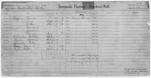 | Keywords: Enrollment for Seminole Census Card 699 - NARA - 268273.tif Scope and content Name Albert Alexander Type Parent Sex Male City of Residence Chickasaw Name Mollie Alexander Type Freedmen Age 23 Sex Female Roll Number 2226 City of Residence cb Name Polly Alexander Type Freedmen Age 18 Sex Female Roll Number 2228 City of Residence cb Name Caesar Bruner Type Parent Sex Male City of Residence cb Name Cleveland Bruner Type Freedmen Age 8 Sex Male Roll Number 2223 City of Residence cb Name Elijah Bruner Type Freedmen Age 1 Sex Male Roll Number 2229 City of Residence cb Name Florence Bruner Type Freedmen Age 2 Sex Female Roll Number 2225 City of Residence cb Name Jamison Bruner Type Freedmen Age 4 Sex Male Roll Number 2224 City of Residence cb Name John Bruner Type Parent Sex Male City of Residence cb Name Lucy Bruner Type Freedmen Age 35 Sex Female Roll Number 2221 City of Residence cb Name Thomas Bruner Type Freedmen Age 34 Sex Male Roll Number 2220 City of Residence cb Name Wilson Bruner Type Freedmen Age 13 Sex Male Roll Number 2222 City of Residence cb Name James Factor Type Owner Sex Male Name Caesar Payne Type Parent Sex Male City of Residence db Name Matt Payne Type Freedmen Age 2 Sex Male Roll Number 2230 City of Residence cb Name Ophelia Payne Type Freedmen Age 2 Sex Female Roll Number 2227 City of Residence cb Name Nancy Warren Type Parent Sex Female City of Residence cb General notes 268273 Local identifier 75-53A-SEMINOLE 699 Department of the Interior Office of Indian Affairs Office of the Commissioner to the Five Civilized Tribes 1893 - 1914 NARA's Southwest Region Fort Worth NRFA 1400 John Burgess Drive Fort Worth TX 76140 Record group Record Group 75 Records of the Bureau of Indian Affairs 1793 - 1999 Record group ARC 404 Enrollment Cards compiled 1898 - 1914 Series ARC 251747 File unit File unit ARC Variant control numbers NAIL Control Number NRFF-75-53A-22935<br /> NAIL Control Number NRFF-75-53A-22983<br /> NAIL Control Number NRFF-75-53A-22997<br /> NAIL Control Number NRFF-75-53A-26058<br /> NAIL Control Number NRFF-75-53A-26071<br /> NAIL Control Number NRFF-75-53A-26105<br /> NAIL Control Number NRFF-75-53A-26125<br /> NAIL Control Number NRFF-75-53A-26168<br /> NAIL Control Number NRFF-75-53A-26204<br /> NAIL Control Number NRFF-75-53A-26265<br /> NAIL Control Number NRFF-75-53A-26440<br /> NAIL Control Number NRFF-75-53A-26469<br /> NAIL Control Number NRFF-75-53A-31195<br /> NAIL Control Number NRFF-75-53A-43686<br /> NAIL Control Number NRFF-75-53A-43723<br /> NAIL Control Number NRFF-75-53A-43726<br /> NAIL Control Number NRFF-75-53A-50630<br /> NAIL Control Number NRFF-75-53A-SEMINOLE 699 yes Other versions <gallery> File Enrollment_for_Seminole_Census_Card_699_-_NARA_-_268273 tif tif File Enrollment_for_Seminole_Census_Card_699_-_NARA_-_268273 jpg jpg </gallery> NARA-cooperation PD-USGov Seminole census cards NARA TIF images with categorized JPGs |