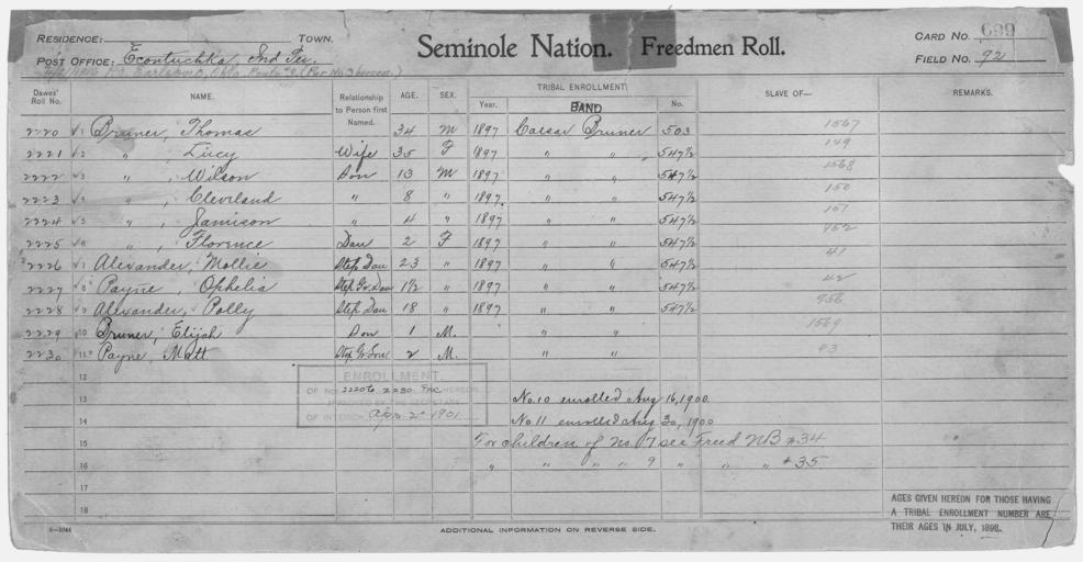 | Keywords: Enrollment for Seminole Census Card 699 - NARA - 268273.jpg Scope and content Name Albert Alexander Type Parent Sex Male City of Residence Chickasaw Name Mollie Alexander Type Freedmen Age 23 Sex Female Roll Number 2226 City of Residence cb Name Polly Alexander Type Freedmen Age 18 Sex Female Roll Number 2228 City of Residence cb Name Caesar Bruner Type Parent Sex Male City of Residence cb Name Cleveland Bruner Type Freedmen Age 8 Sex Male Roll Number 2223 City of Residence cb Name Elijah Bruner Type Freedmen Age 1 Sex Male Roll Number 2229 City of Residence cb Name Florence Bruner Type Freedmen Age 2 Sex Female Roll Number 2225 City of Residence cb Name Jamison Bruner Type Freedmen Age 4 Sex Male Roll Number 2224 City of Residence cb Name John Bruner Type Parent Sex Male City of Residence cb Name Lucy Bruner Type Freedmen Age 35 Sex Female Roll Number 2221 City of Residence cb Name Thomas Bruner Type Freedmen Age 34 Sex Male Roll Number 2220 City of Residence cb Name Wilson Bruner Type Freedmen Age 13 Sex Male Roll Number 2222 City of Residence cb Name James Factor Type Owner Sex Male Name Caesar Payne Type Parent Sex Male City of Residence db Name Matt Payne Type Freedmen Age 2 Sex Male Roll Number 2230 City of Residence cb Name Ophelia Payne Type Freedmen Age 2 Sex Female Roll Number 2227 City of Residence cb Name Nancy Warren Type Parent Sex Female City of Residence cb General notes 268273 Local identifier 75-53A-SEMINOLE 699 Department of the Interior Office of Indian Affairs Office of the Commissioner to the Five Civilized Tribes 1893 - 1914 NARA's Southwest Region Fort Worth NRFA 1400 John Burgess Drive Fort Worth TX 76140 Record group Record Group 75 Records of the Bureau of Indian Affairs 1793 - 1999 Record group ARC 404 Enrollment Cards compiled 1898 - 1914 Series ARC 251747 File unit File unit ARC Variant control numbers NAIL Control Number NRFF-75-53A-22935<br /> NAIL Control Number NRFF-75-53A-22983<br /> NAIL Control Number NRFF-75-53A-22997<br /> NAIL Control Number NRFF-75-53A-26058<br /> NAIL Control Number NRFF-75-53A-26071<br /> NAIL Control Number NRFF-75-53A-26105<br /> NAIL Control Number NRFF-75-53A-26125<br /> NAIL Control Number NRFF-75-53A-26168<br /> NAIL Control Number NRFF-75-53A-26204<br /> NAIL Control Number NRFF-75-53A-26265<br /> NAIL Control Number NRFF-75-53A-26440<br /> NAIL Control Number NRFF-75-53A-26469<br /> NAIL Control Number NRFF-75-53A-31195<br /> NAIL Control Number NRFF-75-53A-43686<br /> NAIL Control Number NRFF-75-53A-43723<br /> NAIL Control Number NRFF-75-53A-43726<br /> NAIL Control Number NRFF-75-53A-50630<br /> NAIL Control Number NRFF-75-53A-SEMINOLE 699 Other versions <gallery> File Enrollment_for_Seminole_Census_Card_699_-_NARA_-_268273 tif tif File Enrollment_for_Seminole_Census_Card_699_-_NARA_-_268273 jpg jpg </gallery> NARA-cooperation PD-USGov Seminole census cards |