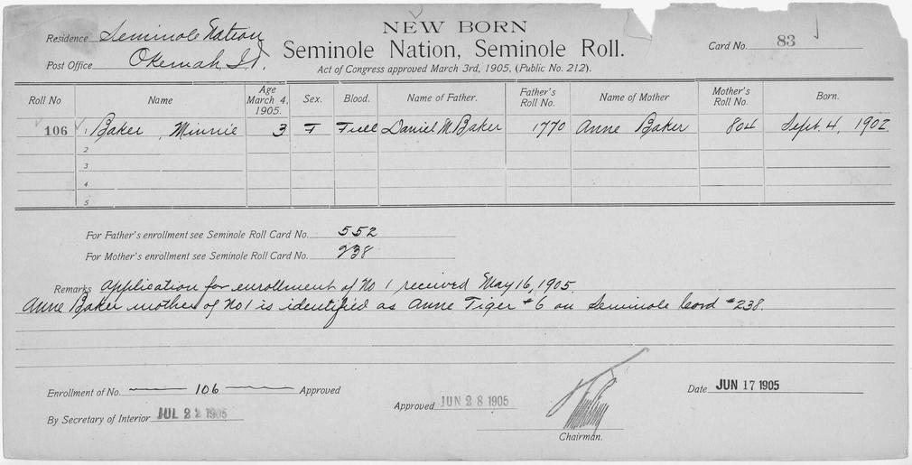 | Keywords: Enrollment for Seminole Census Card 83 - NARA - 267657.tif Scope and content Name Ahaluk Cochutna Type Parent Sex Male City of Residence tp Name Fous Harjo Type By Blood Age 40 Sex Male Degree Indian Blood Full Roll Number 292 City of Residence tp Name Takootska Harjo Type By Blood Age 40 Sex Female Degree Indian Blood Full Roll Number 293 City of Residence tp Name Temothle Harjo Type By Blood Age 14 Sex Female Degree Indian Blood Full Roll Number 294 City of Residence tp Name Tommy Tustenuggy Type Parent Sex Male City of Residence tp Name Minnie Baker Type Newborn Age 3 Sex Female Degree Indian Blood FULL Roll Number 106 Post Office Okemah Name Leathia Ann Doser Type Newborn Freedmen-Rejected Age 1 Sex Female Degree Indian Blood Not Reported Roll Number 90 Post Office Wewoka General notes 267657 Local identifier 75-53A-SEMINOLE 83 Department of the Interior Office of Indian Affairs Office of the Commissioner to the Five Civilized Tribes 1893 - 1914 NARA's Southwest Region Fort Worth NRFA 1400 John Burgess Drive Fort Worth TX 76140 Record group Record Group 75 Records of the Bureau of Indian Affairs 1793 - 1999 Record group ARC 404 Enrollment Cards compiled 1898 - 1914 Series ARC 251747 File unit File unit ARC Variant control numbers NAIL Control Number NRFF-75-53A-28387<br /> NAIL Control Number NRFF-75-53A-34342<br /> NAIL Control Number NRFF-75-53A-35098<br /> NAIL Control Number NRFF-75-53A-35110<br /> NAIL Control Number NRFF-75-53A-50218<br /> NAIL Control Number NRFF-75-53A-52643<br /> NAIL Control Number NRFF-75-53A-52930<br /> NAIL Control Number NRFF-75-53A-SEMINOLE 83 yes Other versions <gallery> File Enrollment_for_Seminole_Census_Card_83_-_NARA_-_267657 tif tif File Enrollment_for_Seminole_Census_Card_83_-_NARA_-_267657 jpg jpg </gallery> NARA-cooperation PD-USGov Cherokee census cards NARA TIF images with categorized JPGs |