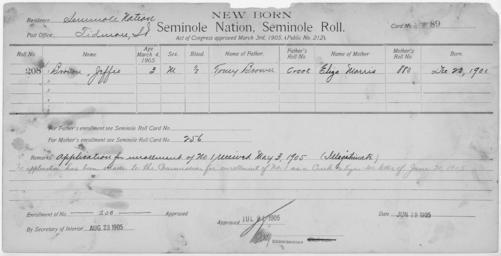 | Keywords: Enrollment for Seminole Census Card 89 - NARA - 267663.tif Scope and content Name Afingy Type Parent Sex Male City of Residence th Name Cheparny Type By Blood Age 3 Sex Male Degree Indian Blood Full Roll Number 313 City of Residence th Name Jim Harjo Type Parent Sex Male City of Residence tp Name Liddia Type Parent Sex Female City of Residence th Name Mollie Type By Blood Age 30 Sex Female Degree Indian Blood Full Roll Number 311 City of Residence th Name Phena Type By Blood Age 5 Sex Female Degree Indian Blood Full Roll Number 312 City of Residence th Name Jeffie Brown Type Newborn Age 3 Sex Male Degree Indian Blood 1/2 Roll Number 208 Post Office Tidmore Name Gracie Davis Type Newborn Freedmen-Rejected Age 3 Sex Female Degree Indian Blood Not Reported Roll Number 93 Post Office Wewoka General notes 267663 Local identifier 75-53A-SEMINOLE 89 Department of the Interior Office of Indian Affairs Office of the Commissioner to the Five Civilized Tribes 1893 - 1914 NARA's Southwest Region Fort Worth NRFA 1400 John Burgess Drive Fort Worth TX 76140 Record group Record Group 75 Records of the Bureau of Indian Affairs 1793 - 1999 Record group ARC 404 Enrollment Cards compiled 1898 - 1914 Series ARC 251747 File unit File unit ARC Variant control numbers NAIL Control Number NRFF-75-53A-22776<br /> NAIL Control Number NRFF-75-53A-27605<br /> NAIL Control Number NRFF-75-53A-34484<br /> NAIL Control Number NRFF-75-53A-39447<br /> NAIL Control Number NRFF-75-53A-42384<br /> NAIL Control Number NRFF-75-53A-44057<br /> NAIL Control Number NRFF-75-53A-52651<br /> NAIL Control Number NRFF-75-53A-52936<br /> NAIL Control Number NRFF-75-53A-SEMINOLE 89 yes Other versions <gallery> File Enrollment_for_Seminole_Census_Card_89_-_NARA_-_267663 tif tif File Enrollment_for_Seminole_Census_Card_89_-_NARA_-_267663 jpg jpg </gallery> NARA-cooperation PD-USGov Cherokee census cards NARA TIF images with categorized JPGs |
