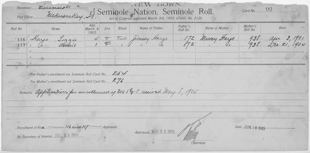 | Keywords: Enrollment for Seminole Census Card 92 - NARA - 267666.tif Scope and content Name Charlie Emarther Type Parent Sex Male City of Residence yh Name Artus Harjo Type By Blood Age 65 Sex Male Degree Indian Blood Full City of Residence th Name Ishitchee Harjo Type By Blood Age 45 Sex Female Degree Indian Blood Full Roll Number 319 City of Residence th Name Lina Harjo Type By Blood Age 18 Sex Female Degree Indian Blood Full Roll Number 320 City of Residence th Name Billy Mingo Type By Blood Age 10 Sex Male Degree Indian Blood Full Roll Number 321 City of Residence th Name Jennie Mingo Type By Blood Age 17 Sex Female Degree Indian Blood Full Roll Number 322 City of Residence th Name Lizzie Harjo Type Newborn Age 4 Sex Female Degree Indian Blood FULL Roll Number 116 Post Office Mekusukey Name Annie Harjo Type Newborn Age 1 Sex Female Degree Indian Blood FULL Roll Number 117 Post Office Mekusukey Name Dollie Doser Type Newborn Freedmen-Rejected Age 2 Sex Female Degree Indian Blood Not Reported Roll Number 129 Post Office Mikuaukey General notes 267666 Local identifier 75-53A-SEMINOLE 92 Department of the Interior Office of Indian Affairs Office of the Commissioner to the Five Civilized Tribes 1893 - 1914 NARA's Southwest Region Fort Worth NRFA 1400 John Burgess Drive Fort Worth TX 76140 Record group Record Group 75 Records of the Bureau of Indian Affairs 1793 - 1999 Record group ARC 404 Enrollment Cards compiled 1898 - 1914 Series ARC 251747 File unit File unit ARC Variant control numbers NAIL Control Number NRFF-75-53A-30874<br /> NAIL Control Number NRFF-75-53A-34105<br /> NAIL Control Number NRFF-75-53A-34439<br /> NAIL Control Number NRFF-75-53A-34598<br /> NAIL Control Number NRFF-75-53A-42207<br /> NAIL Control Number NRFF-75-53A-42211<br /> NAIL Control Number NRFF-75-53A-52654<br /> NAIL Control Number NRFF-75-53A-52655<br /> NAIL Control Number NRFF-75-53A-52940<br /> NAIL Control Number NRFF-75-53A-SEMINOLE 92 yes Other versions <gallery> File Enrollment_for_Seminole_Census_Card_92_-_NARA_-_267666 tif tif File Enrollment_for_Seminole_Census_Card_92_-_NARA_-_267666 jpg jpg </gallery> NARA-cooperation PD-USGov Cherokee census cards NARA TIF images with categorized JPGs |