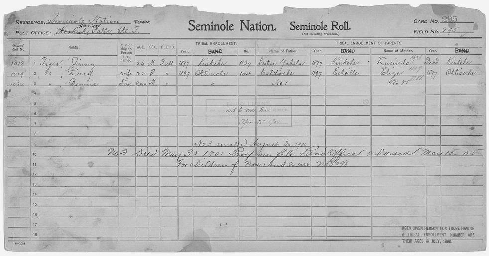 | Keywords: Enrollment for Seminole Census Card 295 - NARA - 267869.tif Scope and content Name Catchoche Type Parent Sex Male City of Residence e Name Eliza Type Parent Sex Female City of Residence o Name Lucinda Type Parent Sex Female City of Residence k Name Bennie Tiger Type By Blood Age 1 Sex Male Degree Indian Blood Full Roll Number 1020 City of Residence o Name Jimmy Tiger Type By Blood Age 26 Sex Male Degree Indian Blood Full Roll Number 1018 City of Residence k Name Lucy Tiger Type By Blood Age 22 Sex Female Degree Indian Blood Full Roll Number 1019 City of Residence o Name Cotsa Yahola Type Parent Sex Male City of Residence k General notes 267869 Local identifier 75-53A-SEMINOLE 295 Department of the Interior Office of Indian Affairs Office of the Commissioner to the Five Civilized Tribes 1893 - 1914 NARA's Southwest Region Fort Worth NRFA 1400 John Burgess Drive Fort Worth TX 76140 Record group Record Group 75 Records of the Bureau of Indian Affairs 1793 - 1999 Record group ARC 404 Enrollment Cards compiled 1898 - 1914 Series ARC 251747 File unit File unit ARC Variant control numbers NAIL Control Number NRFF-75-53A-27373<br /> NAIL Control Number NRFF-75-53A-30802<br /> NAIL Control Number NRFF-75-53A-40124<br /> NAIL Control Number NRFF-75-53A-49370<br /> NAIL Control Number NRFF-75-53A-49532<br /> NAIL Control Number NRFF-75-53A-49653<br /> NAIL Control Number NRFF-75-53A-52100<br /> NAIL Control Number NRFF-75-53A-SEMINOLE 295 yes Other versions <gallery> File Enrollment_for_Seminole_Census_Card_295_-_NARA_-_267869 tif tif File Enrollment_for_Seminole_Census_Card_295_-_NARA_-_267869 jpg jpg </gallery> NARA-cooperation PD-USGov Seminole census cards NARA TIF images with categorized JPGs |