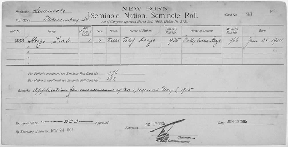 | Keywords: Enrollment for Seminole Census Card 93 - NARA - 267667.tif Scope and content Name Concharte Type Parent Sex Female City of Residence k Name Konibbe Type Parent Sex Male City of Residence th Name Mabeta Type Parent Sex Female City of Residence tp Name Aha Micco Type Parent Sex Male City of Residence th Name Talmascy Type By Blood Age 40 Sex Male Degree Indian Blood Full Roll Number 323 City of Residence k Name Alfred Talmascy Type By Blood Age 12 Sex Male Degree Indian Blood Full Roll Number 325 City of Residence tp Name Anna Talmascy Type By Blood Age 4 Sex Female Degree Indian Blood Full City of Residence tp Name Eliza Talmascy Type By Blood Age 39 Sex Female Degree Indian Blood Full Roll Number 324 City of Residence tp Name Hoktoche Talmascy Type By Blood Age 1 Sex Female Degree Indian Blood Full Roll Number 328 City of Residence tp Name Kanate Talmascy Type By Blood Age 8 Sex Male Degree Indian Blood Full Roll Number 326 City of Residence tp Name Pussy Talmascy Type By Blood Age 6 Sex Female Degree Indian Blood Full Roll Number 327 City of Residence tp Name Leah Harjo Type Newborn Age 1 Sex Female Degree Indian Blood FULL Roll Number 233 Post Office Mekusukey General notes 267667 Local identifier 75-53A-SEMINOLE 93 Department of the Interior Office of Indian Affairs Office of the Commissioner to the Five Civilized Tribes 1893 - 1914 NARA's Southwest Region Fort Worth NRFA 1400 John Burgess Drive Fort Worth TX 76140 Record group Record Group 75 Records of the Bureau of Indian Affairs 1793 - 1999 Record group ARC 404 Enrollment Cards compiled 1898 - 1914 Series ARC 251747 File unit File unit ARC Variant control numbers NAIL Control Number NRFF-75-53A-28658<br /> NAIL Control Number NRFF-75-53A-38896<br /> NAIL Control Number NRFF-75-53A-40273<br /> NAIL Control Number NRFF-75-53A-41820<br /> NAIL Control Number NRFF-75-53A-48531<br /> NAIL Control Number NRFF-75-53A-48532<br /> NAIL Control Number NRFF-75-53A-48533<br /> NAIL Control Number NRFF-75-53A-48534<br /> NAIL Control Number NRFF-75-53A-48537<br /> NAIL Control Number NRFF-75-53A-48538<br /> NAIL Control Number NRFF-75-53A-48539<br /> NAIL Control Number NRFF-75-53A-52656<br /> NAIL Control Number NRFF-75-53A-SEMINOLE 93 yes Other versions <gallery> File Enrollment_for_Seminole_Census_Card_93_-_NARA_-_267667 tif tif File Enrollment_for_Seminole_Census_Card_93_-_NARA_-_267667 jpg jpg </gallery> NARA-cooperation PD-USGov Cherokee census cards NARA TIF images with categorized JPGs |