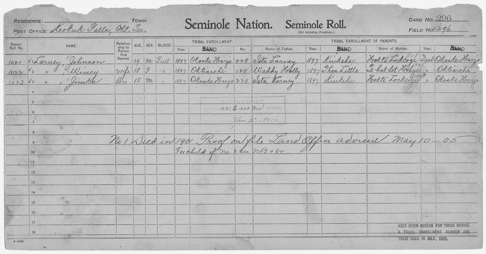 | Keywords: Enrollment for Seminole Census Card 296 - NARA - 267870.tif Scope and content Name Tehallot Heohye Type Parent Sex Female City of Residence o Name Waddy Holly Type Parent Sex Male City of Residence tl Name Ista Larney Type Parent Sex Male City of Residence k Name Jimka Larney Type By Blood Age 15 Sex Male Degree Indian Blood Full Roll Number 1023 City of Residence oh Name Johnson Larney Type By Blood Age 19 Sex Male Degree Indian Blood Full Roll Number 1021 City of Residence oh Name Winey Larney Type By Blood Age 18 Sex Female Degree Indian Blood Full Roll Number 1022 City of Residence o Name Hokte Lockcoge Type Parent Sex Female City of Residence oh General notes 267870 Local identifier 75-53A-SEMINOLE 296 Department of the Interior Office of Indian Affairs Office of the Commissioner to the Five Civilized Tribes 1893 - 1914 NARA's Southwest Region Fort Worth NRFA 1400 John Burgess Drive Fort Worth TX 76140 Record group Record Group 75 Records of the Bureau of Indian Affairs 1793 - 1999 Record group ARC 404 Enrollment Cards compiled 1898 - 1914 Series ARC 251747 File unit File unit ARC Variant control numbers NAIL Control Number NRFF-75-53A-36104<br /> NAIL Control Number NRFF-75-53A-36583<br /> NAIL Control Number NRFF-75-53A-39005<br /> NAIL Control Number NRFF-75-53A-39014<br /> NAIL Control Number NRFF-75-53A-39020<br /> NAIL Control Number NRFF-75-53A-39071<br /> NAIL Control Number NRFF-75-53A-39664<br /> NAIL Control Number NRFF-75-53A-SEMINOLE 296 yes Other versions <gallery> File Enrollment_for_Seminole_Census_Card_296_-_NARA_-_267870 tif tif File Enrollment_for_Seminole_Census_Card_296_-_NARA_-_267870 jpg jpg </gallery> NARA-cooperation PD-USGov Seminole census cards NARA TIF images with categorized JPGs |
