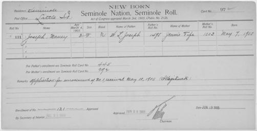 | Keywords: Enrollment for Seminole Census Card 97 - NARA - 267671.tif  Scope and content Name Hoktoke Type By Blood Age 14 Sex Female Degree Indian Blood Full Roll Number 341 City of Residence tp Name Itchkanaaha Type Parent Sex Female City of Residence tp Name Jannie Type By Blood Age 55 Sex Female Degree Indian Blood Full Roll Number 339 City of Residence o Name Josey Type By Blood Age 8 Sex Male Degree Indian Blood Full Roll Number 342 City of Residence tp Name Ponnokee Type By Blood Age 45 Sex Male Degree Indian Blood Full Roll Number 338 City of Residence th Name Sefah Type By Blood Age 18 Sex Male Degree Indian Blood Full Roll Number 340 City of Residence tp Name Maney Joseph Type Newborn Age 3 Sex Female Degree Indian Blood 3/4 Roll Number 121 Post Office Little General notes 267671 Local identifier 75-53A-SEMINOLE 97 Department of the Interior Office of Indian Affairs Office of the Commissioner to the Five Civilized Tribes 1893 - 1914 NARA's Southwest Region Fort Worth NRFA 1400 John Burgess Drive Fort Worth TX 76140 Record group Record Group 75 Records of the Bureau of Indian Affairs 1793 - 1999 Record group ARC 404 Enrollment Cards compiled 1898 - 1914 Series ARC 251747 File unit File unit ARC Variant control numbers NAIL Control Number NRFF-75-53A-36520<br /> NAIL Control Number NRFF-75-53A-37219<br /> NAIL Control Number NRFF-75-53A-37472<br /> NAIL Control Number NRFF-75-53A-38180<br /> NAIL Control Number NRFF-75-53A-44358<br /> NAIL Control Number NRFF-75-53A-46434<br /> NAIL Control Number NRFF-75-53A-52663<br /> NAIL Control Number NRFF-75-53A-SEMINOLE 97 yes Other versions <gallery> File Enrollment_for_Seminole_Census_Card_97_-_NARA_-_267671 tif tif File Enrollment_for_Seminole_Census_Card_97_-_NARA_-_267671 jpg jpg </gallery> NARA-cooperation PD-USGov Cherokee census cards NARA TIF images with categorized JPGs |
