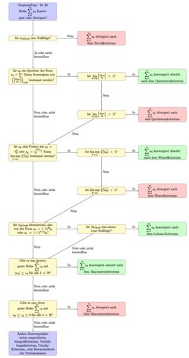 | Keywords: Entscheidungsbaum zur Konvergenz und Divergenz von Reihen.svg de Entscheidungsbaum zur Konvergenz und Divergenz von Reihen 2016-10-22 own http //kulla me Stephan Kulla User Stephan Kulla other versions <gallery> Konvergenzschema für Reihen pdf Version von Benutzer Who2010 </gallery> Source code <syntaxhighlight lang tex> \documentclass12pt border 10pt standalone \usepackagelatin1 inputenc \usepackage amsmath \usepackage amssymb \usepackage tikz \usetikzlibrary shapes arrows positioning \everymath \displaystyle \newcommand \N \mathbb N \begin document \tikzstyle decision rectangle draw fill yellow 20 text centered rounded corners \tikzstyle label text width 3cm \tikzstyle block rectangle draw fill blue 20 text centered rounded corners \tikzstyle convergence rectangle draw fill green 20 node distance 8cm text centered rounded corners \tikzstyle divergence rectangle draw fill red 20 node distance 8cm text centered rounded corners \tikzstyle line -stealth thick draw \begin tikzpicture node distance 5cm auto text width 6cm \node block init \emph Ausgangsfrage Ist die Reihe \sum_ k 1 \infty a_k konvergent oder divergent ; \node decision below of init node distance 3 5cm questiontrivialkriterium Ist a_k _ k\in\N eine Nullfolge ; \node divergence right of questiontrivialkriterium node distance 9cm trivialkriterium \sum_ k 1 \infty a_k divergiert nach dem Trivialkriterium ; \node decision below of questiontrivialkriterium question_ratio_test Ist a_k ein Quotient der Form a_k \tfrac b_k c_k Kann Konvergenz von \left \left \tfrac a_ k+1 a_k \right \right _ k\in\N bestimmt werden ; \node decision right of question_ratio_test node distance 9cm rtcase1 Ist \lim_ k\to\infty \left \tfrac a_ k+1 a_k \right < 1 ; \node decision below of rtcase1 rtcase2 Ist \lim_ k\to\infty \left \tfrac a_ k+1 a_k \right > 1 ; \node convergence right of rtcase1 ratio_yes \sum_ k 1 \infty a_k konvergiert absolut nach dem Quotientenkriterium ; \node divergence right of rtcase2 ratio_no \sum_ k 1 \infty a_k divergiert nach dem Quotientenkriterium ; \node decision below of rtcase2 rootcase1 Ist \limsup_ k\to\infty \sqrtk a_k < 1 ; \node decision left of rootcase1 node distance 9cm question_root_test Ist a_k eine Potenz wie a_k b_k k oder a_k c_k \left k 2\right Kann \limsup_ k\to\infty \sqrtk a_k bestimmt werden ; \node decision below of rootcase1 rootcase2 Ist \limsup_ k\to\infty \sqrtk a_k > 1 ; \node convergence right of rootcase1 root_yes \sum_ k 1 \infty a_k konvergiert absolut nach dem Wurzelkriterium ; \node divergence right of rootcase2 root_no \sum_ k 1 \infty a_k divergiert nach dem Wurzelkriterium ; \node decision below of rootcase2 leibniz_case Ist b_k _ k\in\N eine monotone Nullfolge ; \node convergence right of leibniz_case leibniz_yes \sum_ k 1 \infty a_k konvergiert nach dem Leibniz-Kriterium ; \node decision left of leibniz_case node distance 9cm leibniz_question Ist a_k _ k\in\N alternierend also von der Form a_k -1 k b_k oder a_k -1 k+1 b_k ; \node decision below of leibniz_question majorcase Gibt es eine konvergente Reihe \sum_ k 1 \infty c_k mit a_k \le c_k für alle k\in\N ; \node decision below of majorcase node distance 5 5cm minorcase Gibt es eine divergente Reihe \sum_ k 1 \infty c_k mit a_k\ge c_k\ge 0 für alle k\in\N ; \node block below of minorcase node distance 4 5cm end Andere Konvergenzkriterien ausprobieren \\ Integralkriterium Verdichtungskriterium Cauchy-Kriterium oder Beschränktheit der Partialsummen ; \node convergence right of majorcase node distance 9cm major_yes \sum_ k 1 \infty a_k konvergiert absolut nach dem Majorantenkriterium ; \node divergence right of minorcase node distance 9cm minor_no \sum_ k 1 \infty a_k divergiert nach dem Minorantenkriterium ; \path line init edge questiontrivialkriterium ; \path line questiontrivialkriterium -- node xshift 3cm Nein trivialkriterium ; \path line questiontrivialkriterium -- node label Ja oder nicht feststellbar question_ratio_test ; \path line question_ratio_test -- node xshift 3cm Ja rtcase1 ; \path line rtcase1 -- node Nein rtcase2 ; \path line rootcase1 -- node Nein rootcase2 ; \path line question_ratio_test -- node label Nein oder nicht feststellbar question_root_test ; \path line rtcase2 -- node label Nein question_root_test ; \path line rtcase1 -- node xshift 3cm Ja ratio_yes ; \path line rtcase2 -- node xshift 3cm Ja ratio_no ; \path line rootcase1 -- node xshift 3cm Ja root_yes ; \path line rootcase2 -- node xshift 3cm Ja root_no ; \path line question_root_test -- node label Nein oder nicht feststellbar leibniz_question ; \path line rootcase2 -- node Nein leibniz_question ; \path line question_root_test -- node xshift 3cm Ja rootcase1 ; \path line leibniz_question -- node xshift 3cm Ja leibniz_case ; \path line leibniz_case -- node xshift 3cm Ja leibniz_yes ; \path line leibniz_question -- node label Nein majorcase ; \path line leibniz_case -- node label Nein oder nicht feststellbar majorcase ; \path line majorcase -- node label Nein oder nicht feststellbar minorcase ; \path line minorcase -- node label Nein oder nicht feststellbar end ; \path line majorcase -- node xshift 3cm Ja major_yes ; \path line minorcase -- node xshift 3cm Ja minor_no ; \end tikzpicture \end document </syntaxhighlight> cc-zero Series mathematics Decision diagrams Flow charts |